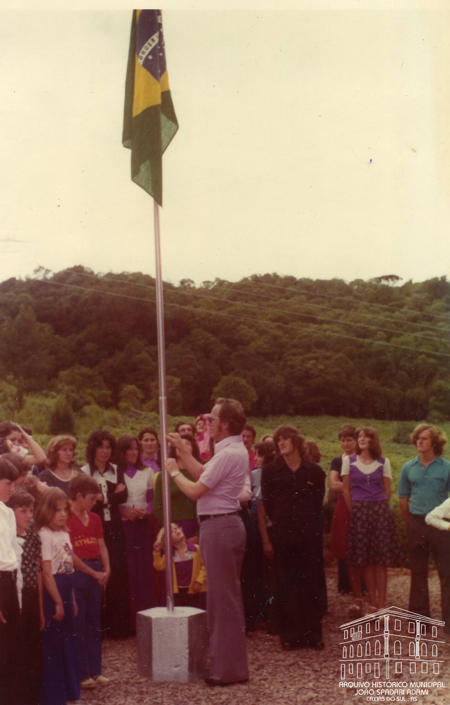 Hasteamento da Bandeira Nacional na inauguração do Grupo Escolar Municipal Lobo da Costa localizado no Travessão Cremona, São Brás, Ana Rech, em dezembro de 1974.