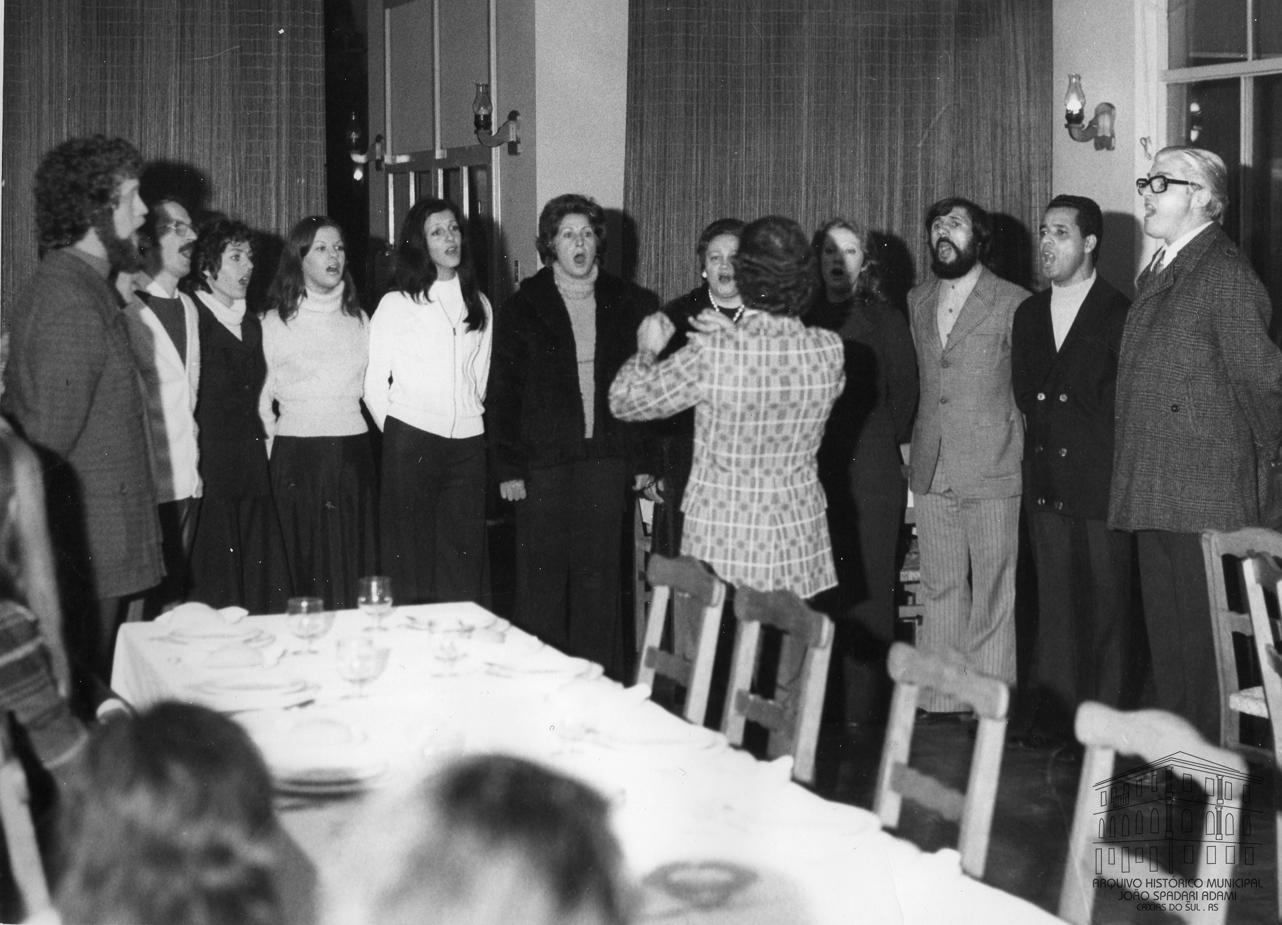 Pré- estreia do Coral Madrigal Casa de Savóia, no Restaurante Querência, em 28 de maio de 1974. De costas, maestro Alcides Verza.