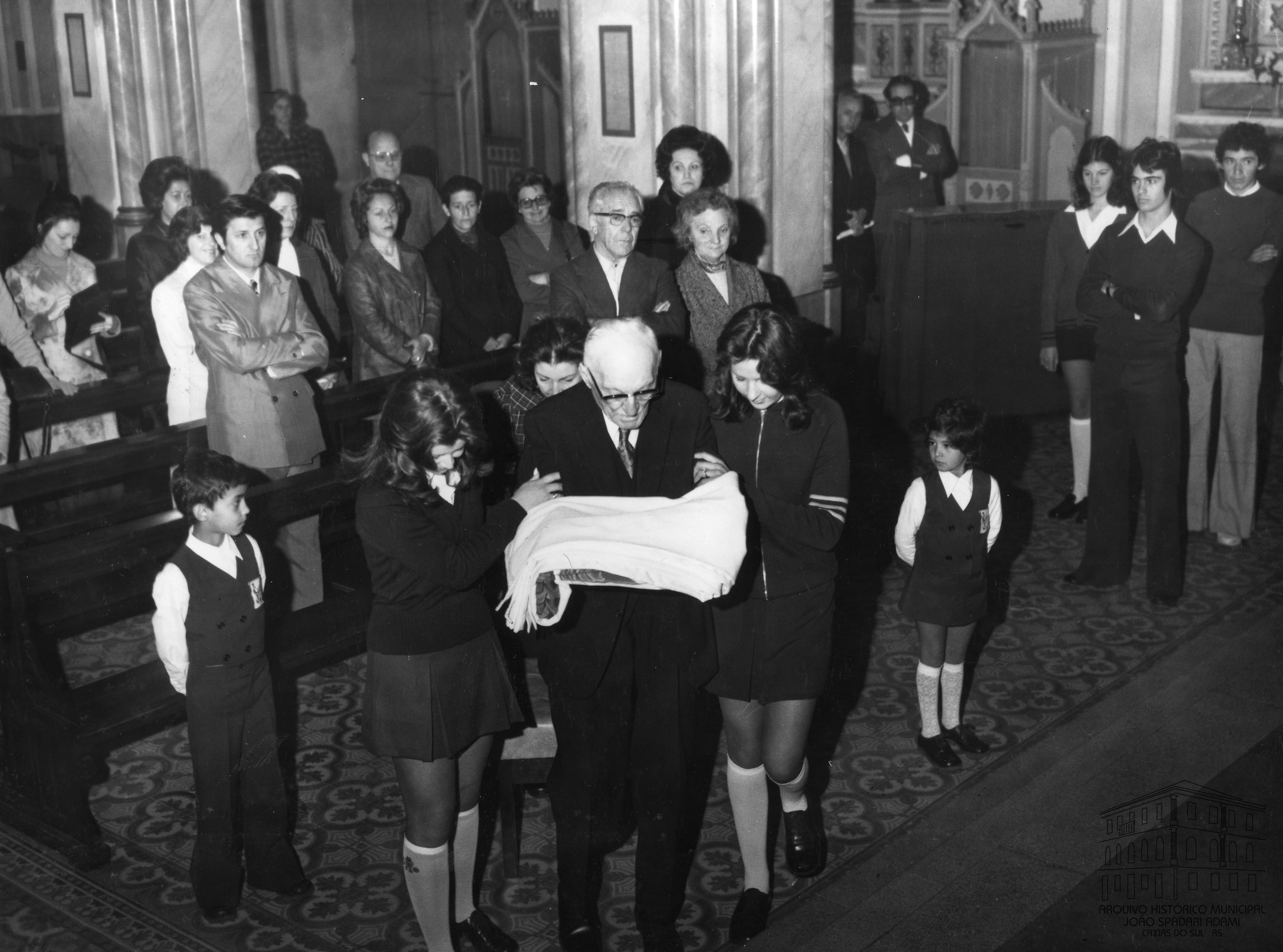 Cerimônia ecumênica realizada na Catedral Diocesana, em 1º de junho de 1974. Angelo de Carli levando a Bandeira de Caxias para ser abençoada.