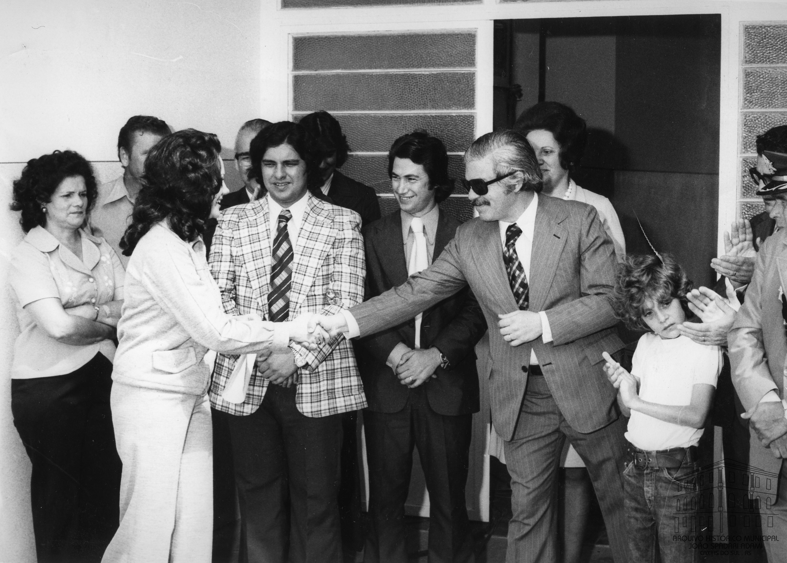 Prefeito Mário Bernardino Ramos cumprimenta a diretora do Grupo Escolar Municipal Presidente Castelo Branco, no bairro Fátima. Atrás do Prefeito, Santina Barp Amorim, Secretária Municipal da Educação e Cultura e, ao seu lado, vice-prefeito Mário David Vanin.