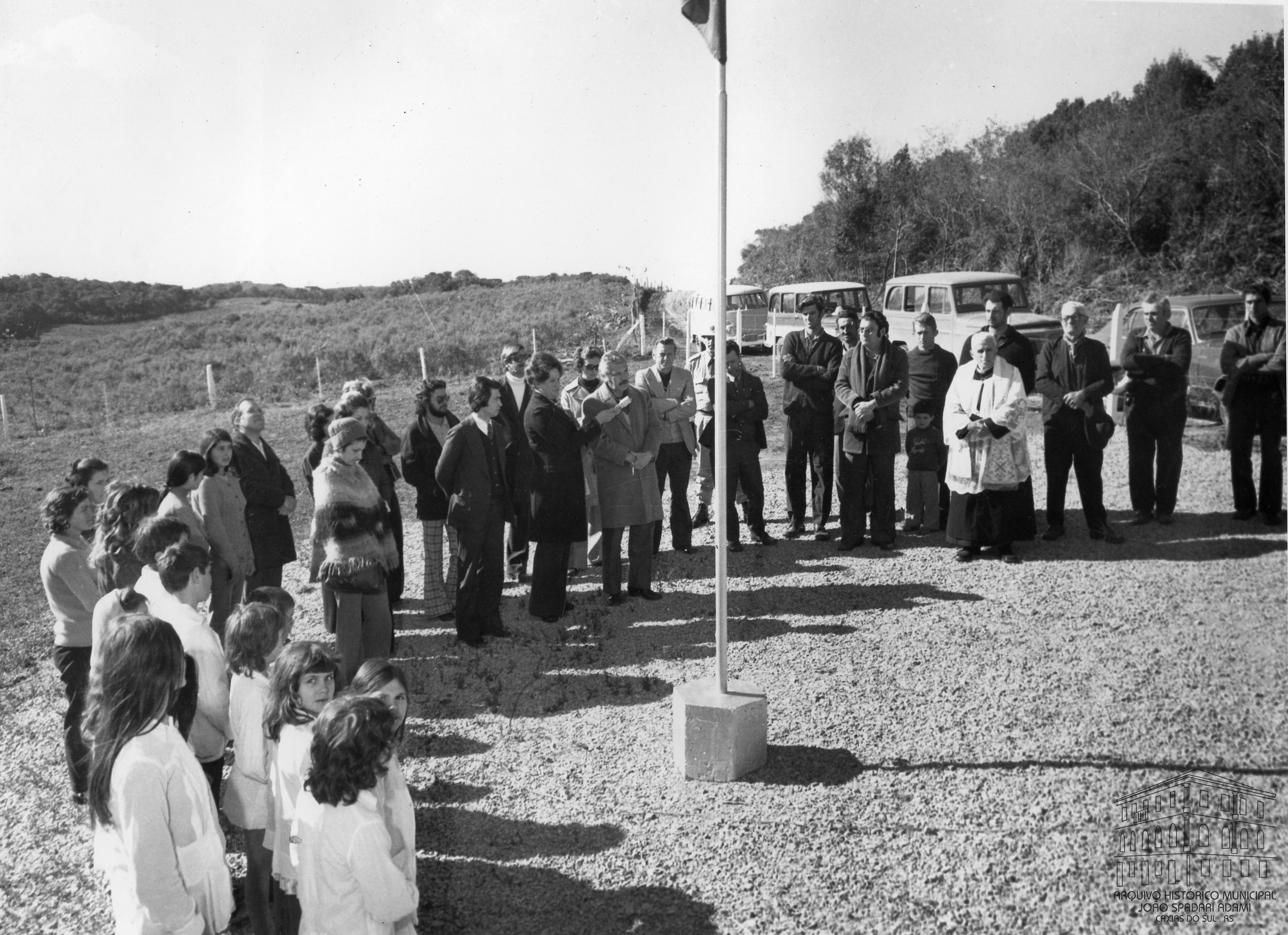 Inauguração da Escola Municipal Ararigboia, situada na Linha Colônia Vitalina, distrito de Santa Lúcia do Piaí, em 05 de junho de 1974, durante a Semana de Caxias. Segurando o microfone, Santina Barp Amorim, Secretária Municipal da Educação e Cultura; à esquerda, vice-prefeito Mário David Vanin e, à direita, Prefeito Mário Bernardino Ramos.