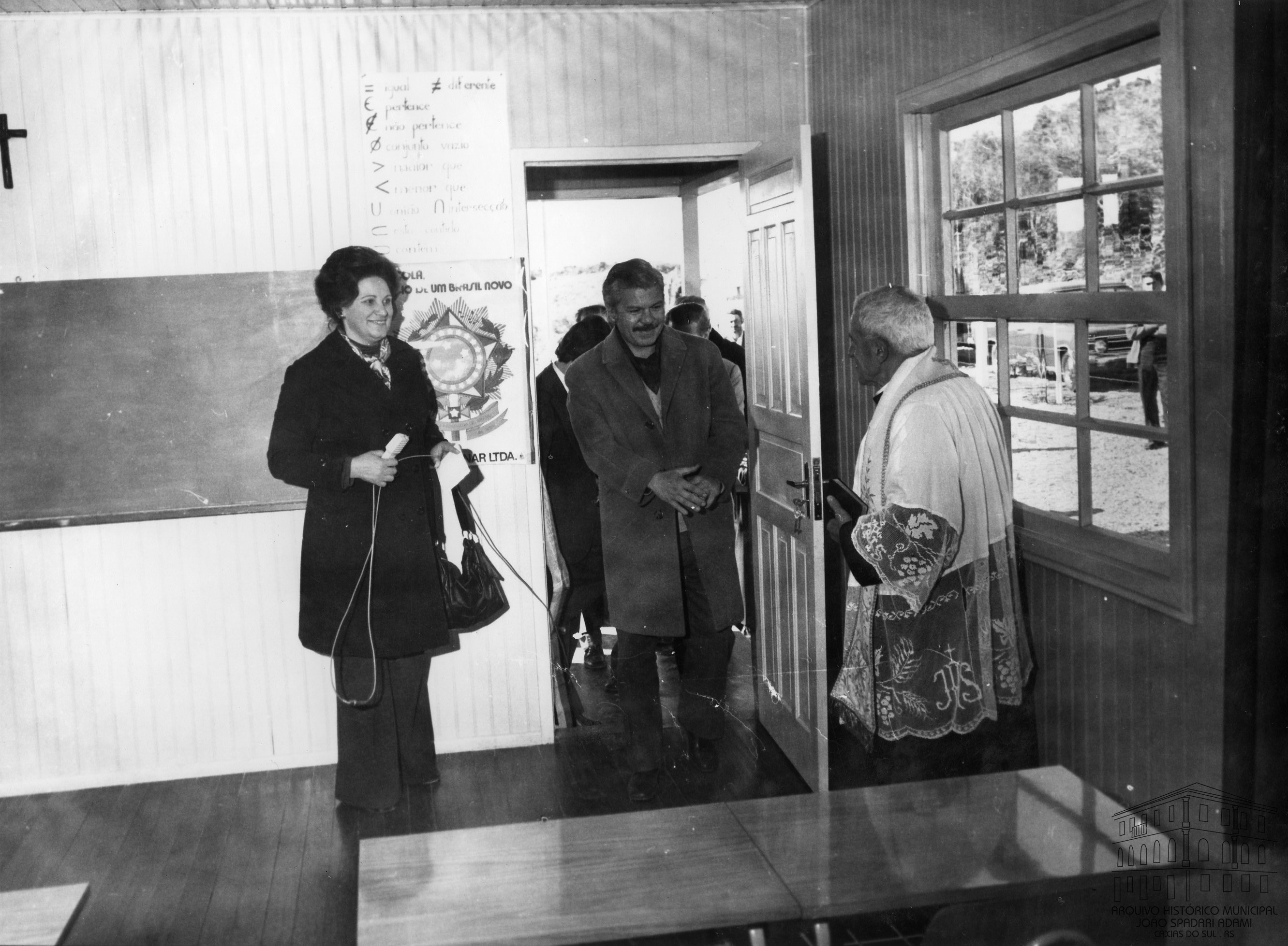 Santina Barp Amorim, Secretária Municipal da Educação e Cultura, Prefeito Mário Bernardino Ramos e sacerdote na inauguração da Escola Municipal Cecília Meireles, localizada na Linha São Paulo, distrito de Santa Lúcia do Piaí, em 05 de junho de 1974.