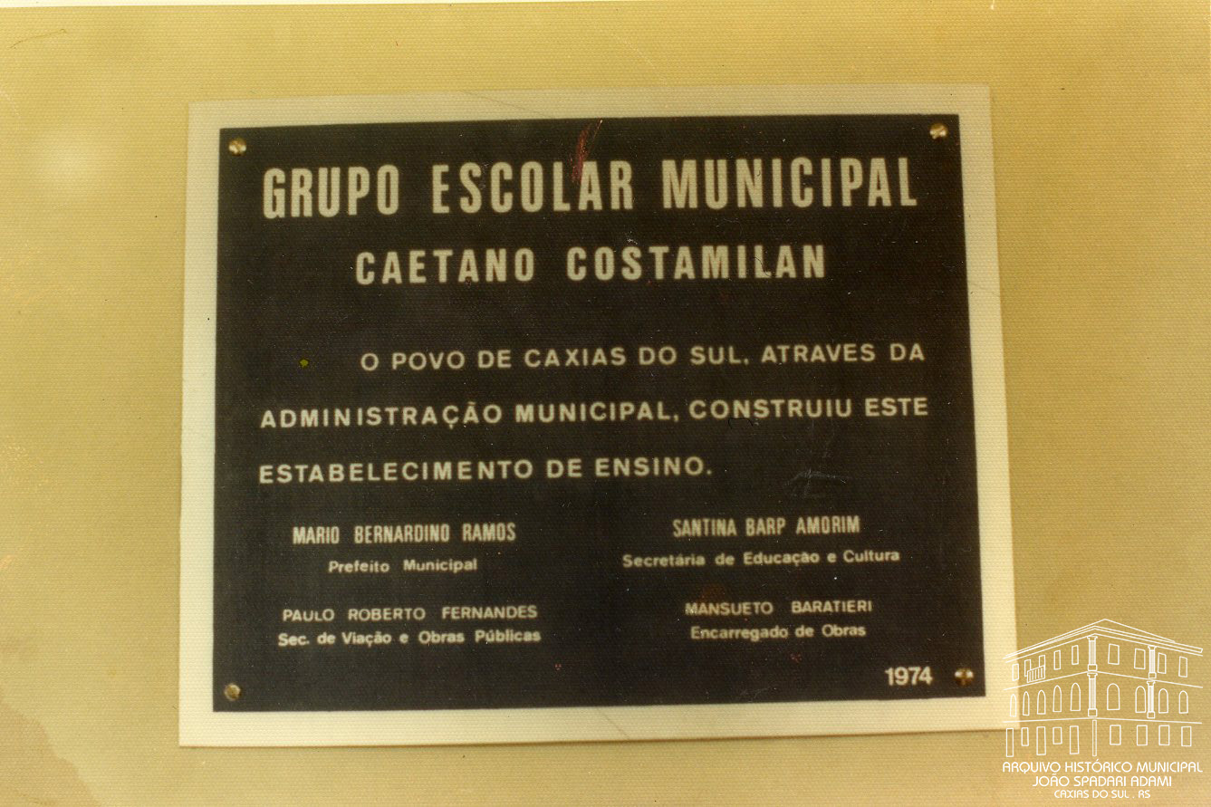 Placa de inauguração do Grupo Escolar Municipal Caetano Costamilan localizado em Loreto, 2ª Légua, inaugurado em dezembro de 1974.