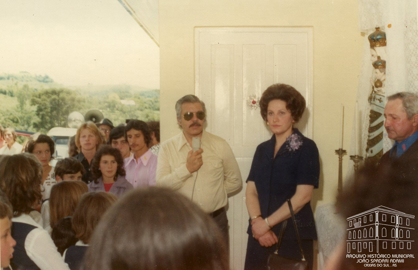 Ao microfone, Prefeito Mário Bernardino Ramos e ao seu lado, Santina Barp Amorim, Secretária Municipal da Educação e Cultura, na inauguração do Grupo Escolar Municipal Caetano Costamilan, localizado em Loreto, 2ª Légua, em dezembro de 1974.