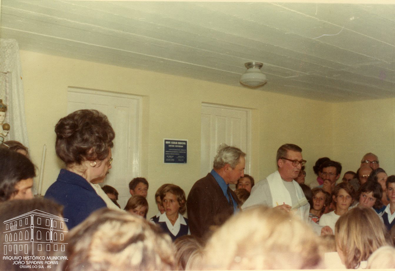 Sacerdote e comunidade escolar na inauguração do Grupo Escolar Municipal Caetano Costamilan, localizado em Loreto, 2ª Légua, em dezembro de 1974.