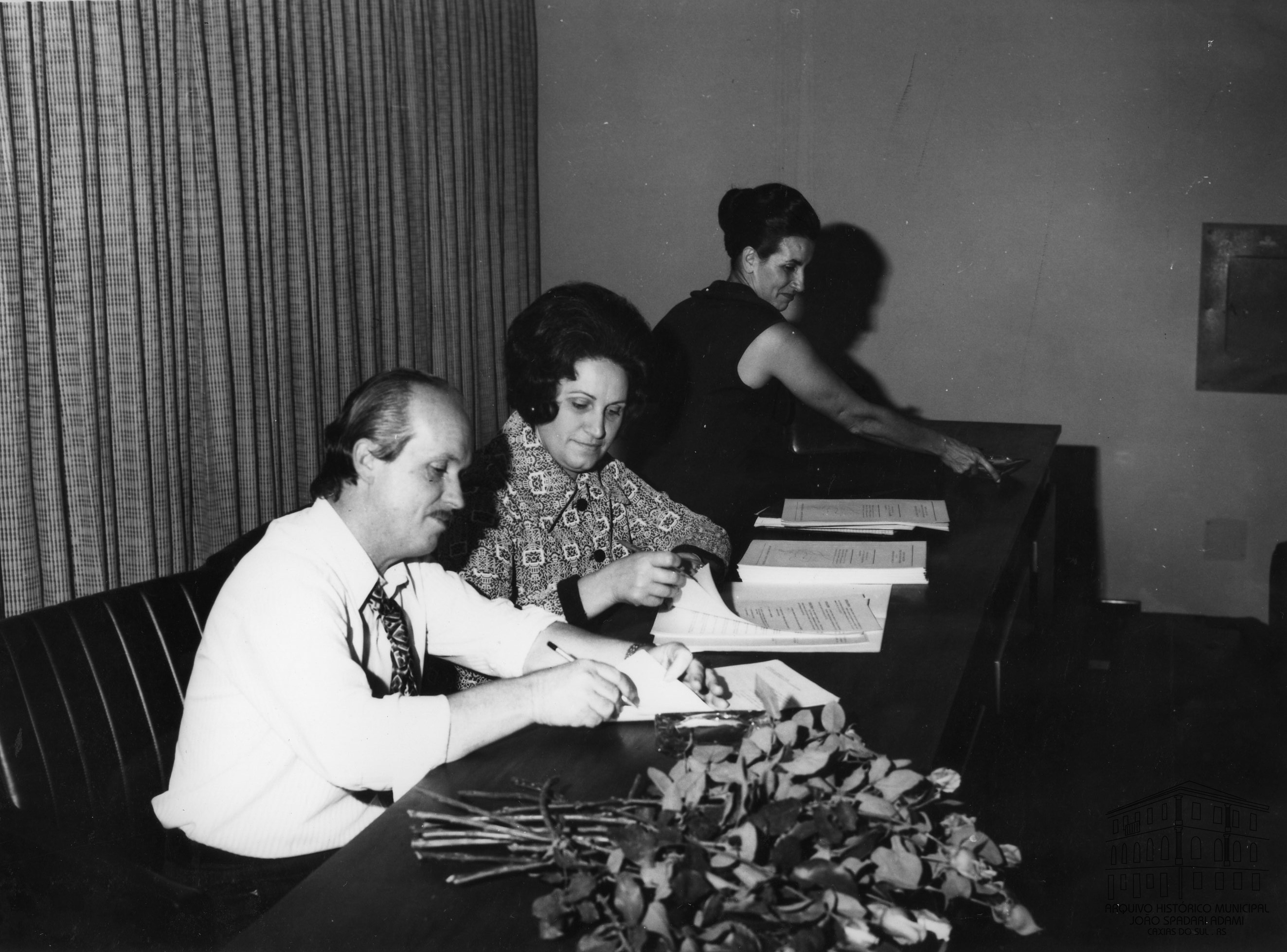 Ao centro, Santina Barp Amorim, Secretária Municipal da Educação e Cultura, na assinatura do convênio com o MOBRAL central para o Projeto 008 no SENAC, em 31 de março de 1974.