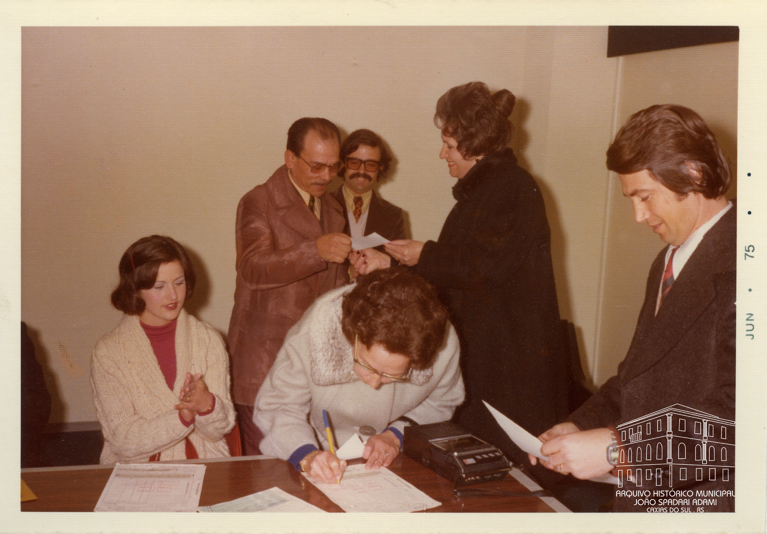 No Gabinete, Prefeito Mário David Vanin na entrega de prêmios aos vencedores do concurso para o Hino do Centenário de Caxias do Sul. De casaco preto, Santina Barp Amorim, Secretária Municipal da Educação e Cultura.