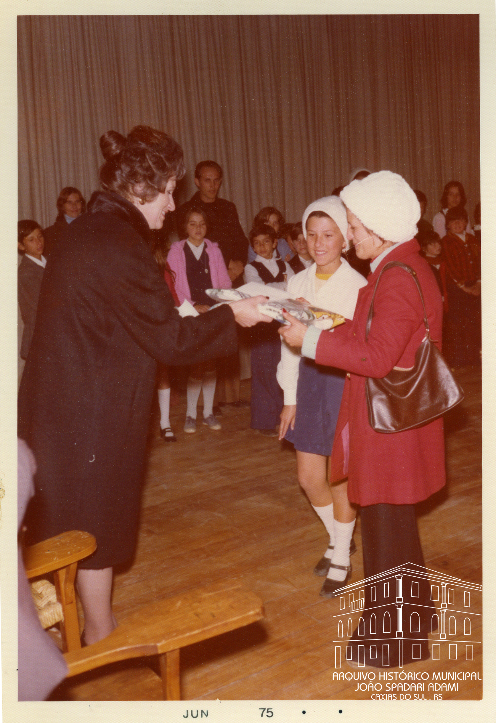 Santina Barp Amorim, Secretária Municipal da Educação e Cultura, na entrega de prêmios aos alunos dos Grupos Escolares Municipais, vencedores da Gincana Cultural, evento da Semana de Caxias 1975.