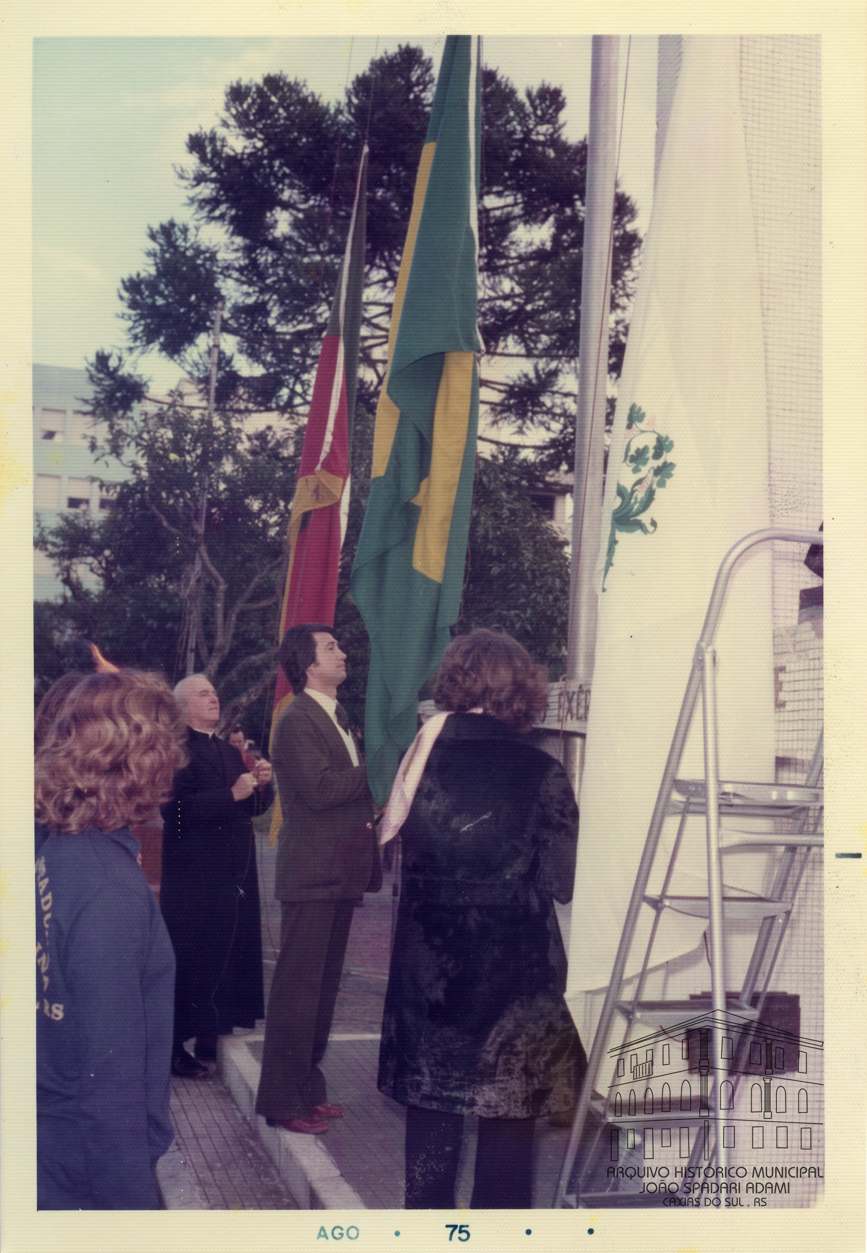 Ao centro, Prefeito Mário David Vanin no hasteamento de Bandeiras na Praça Rui Barbosa, atual Praça Dante Alighieri, nas comemorações da Semana da Pátria 1975.