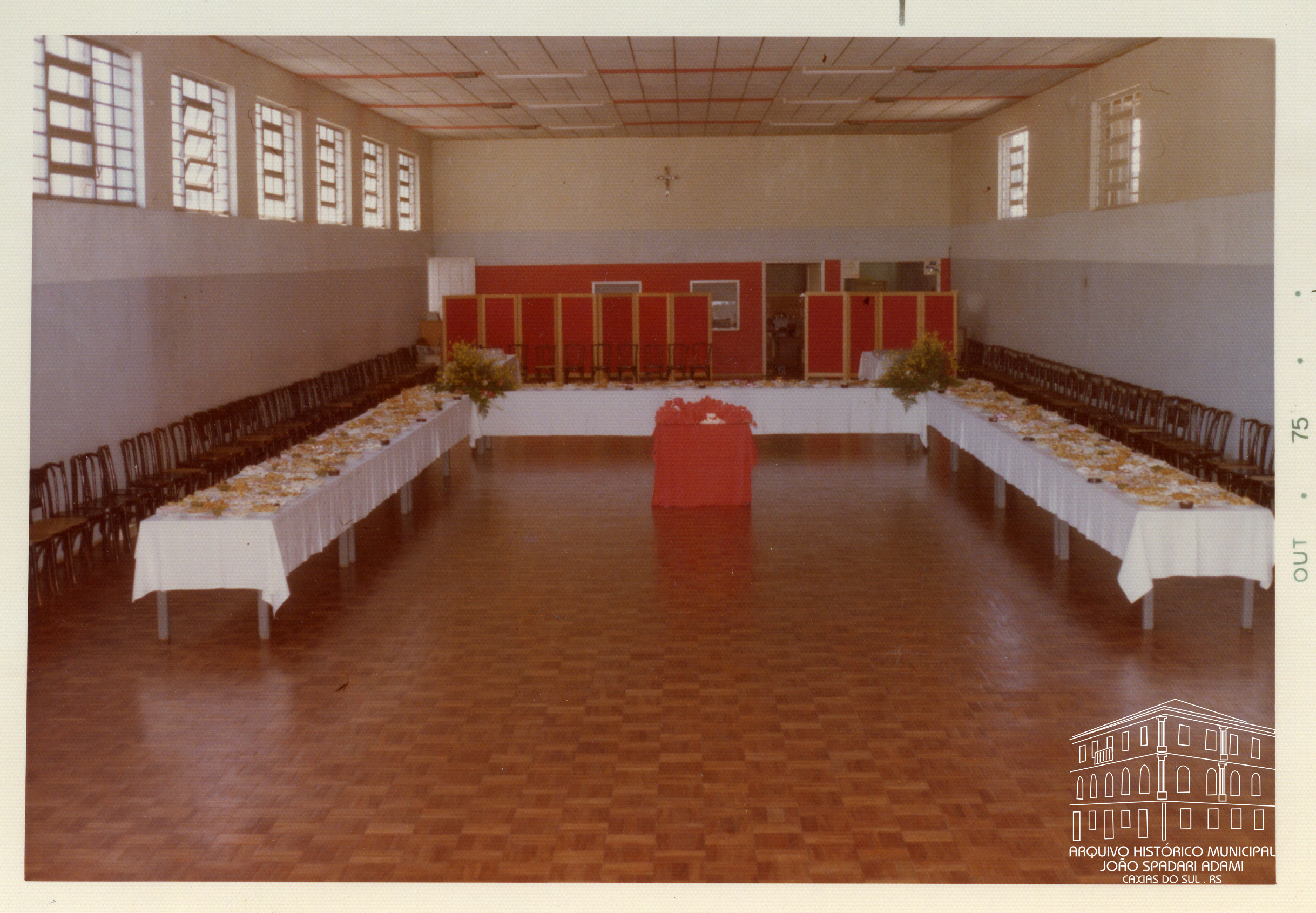 Organização das mesas no Salão Paroquial Nossa Senhora de Lourdes para comemoração ao Dia do Professor, em 15 de outubro de 1975.