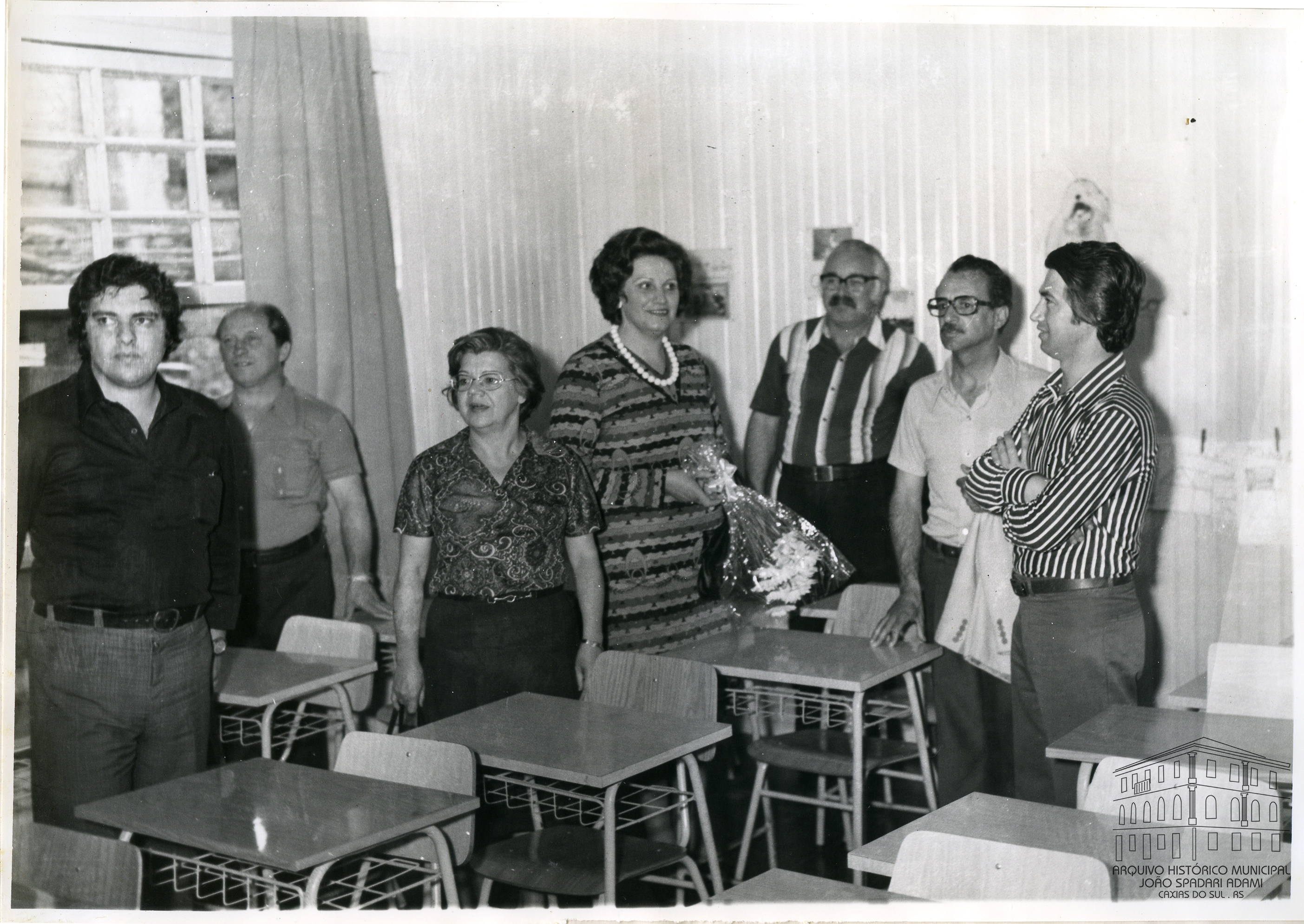 Autoridades no interior da Escola Municipal Adelmar Faccioli, localizada em Caravággio da 3º légua, no dia da inauguração, em 23 de dezembro de 1975. De colar, Santina Barp Amorim, Secretária Municipal da Educação e Cultura e, de camisa listrada, Prefeito Mário David Vanin.