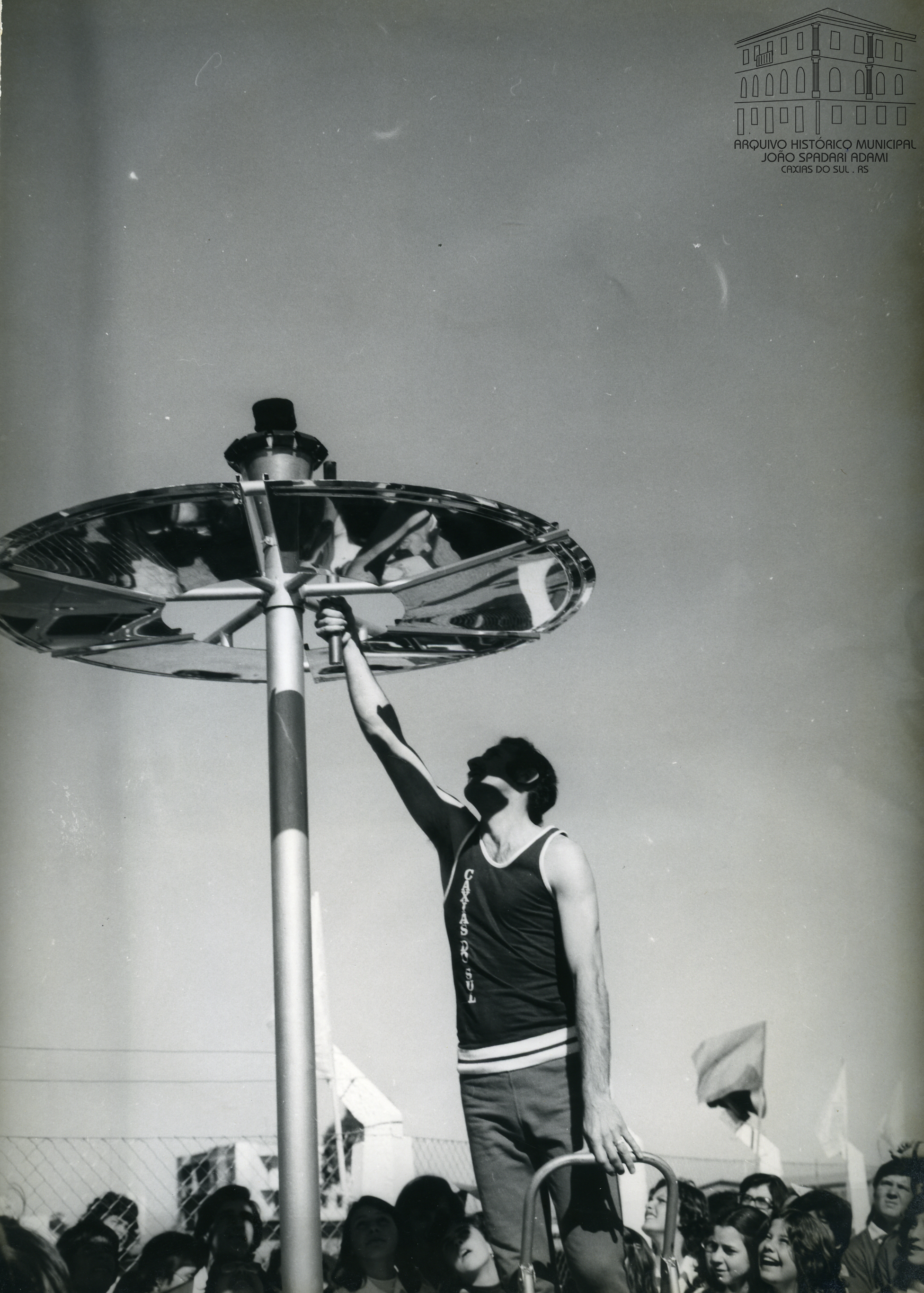 Atleta na cerimônia com Fogo Simbólico na inauguração do Estádio Municipal de Atletismo, em 23 de outubro de 1975.