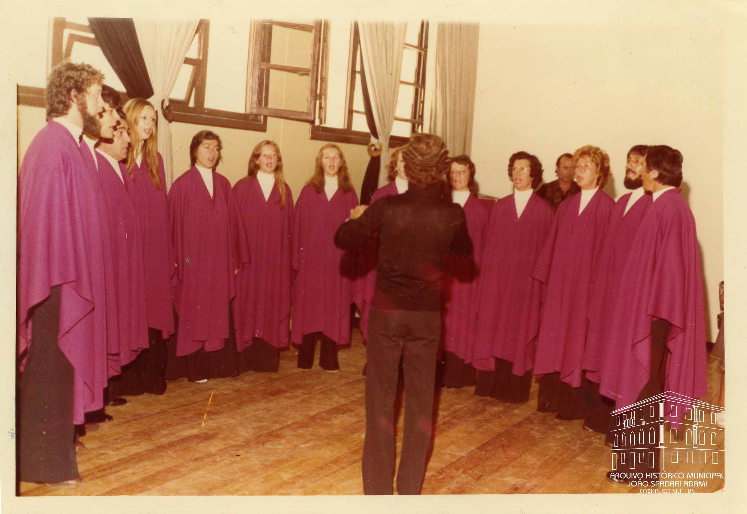 Apresentação do Coral Madrigal na inauguração do Museu Municipal em 06 de fevereiro de 1975. De costas, regente Alcides Verza.