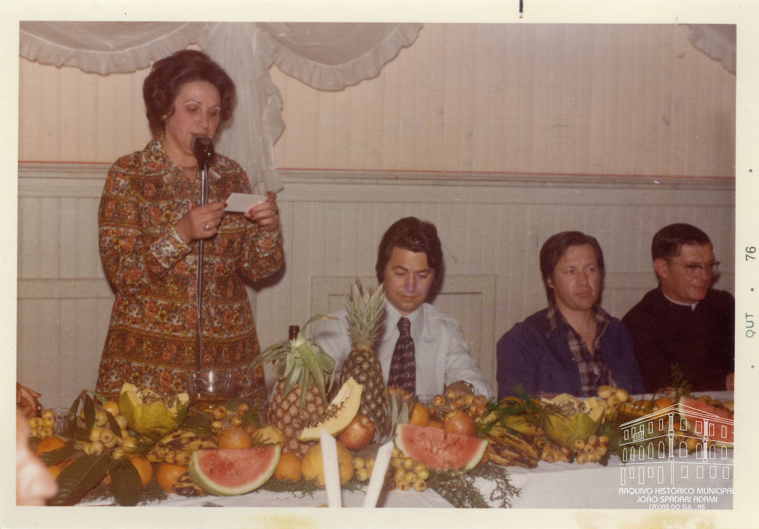 Ao microfone, Santina Barp Amorin, Secretária Municipal da Educação, no almoço em homenagem aos professores municipais, realizado na Casa Paroquial São Pelegrino, em 15 de outubro de 1976. Ao centro, Prefeito Mário David Vanin e, à direita, padre Eugênio Ângelo Giordani.