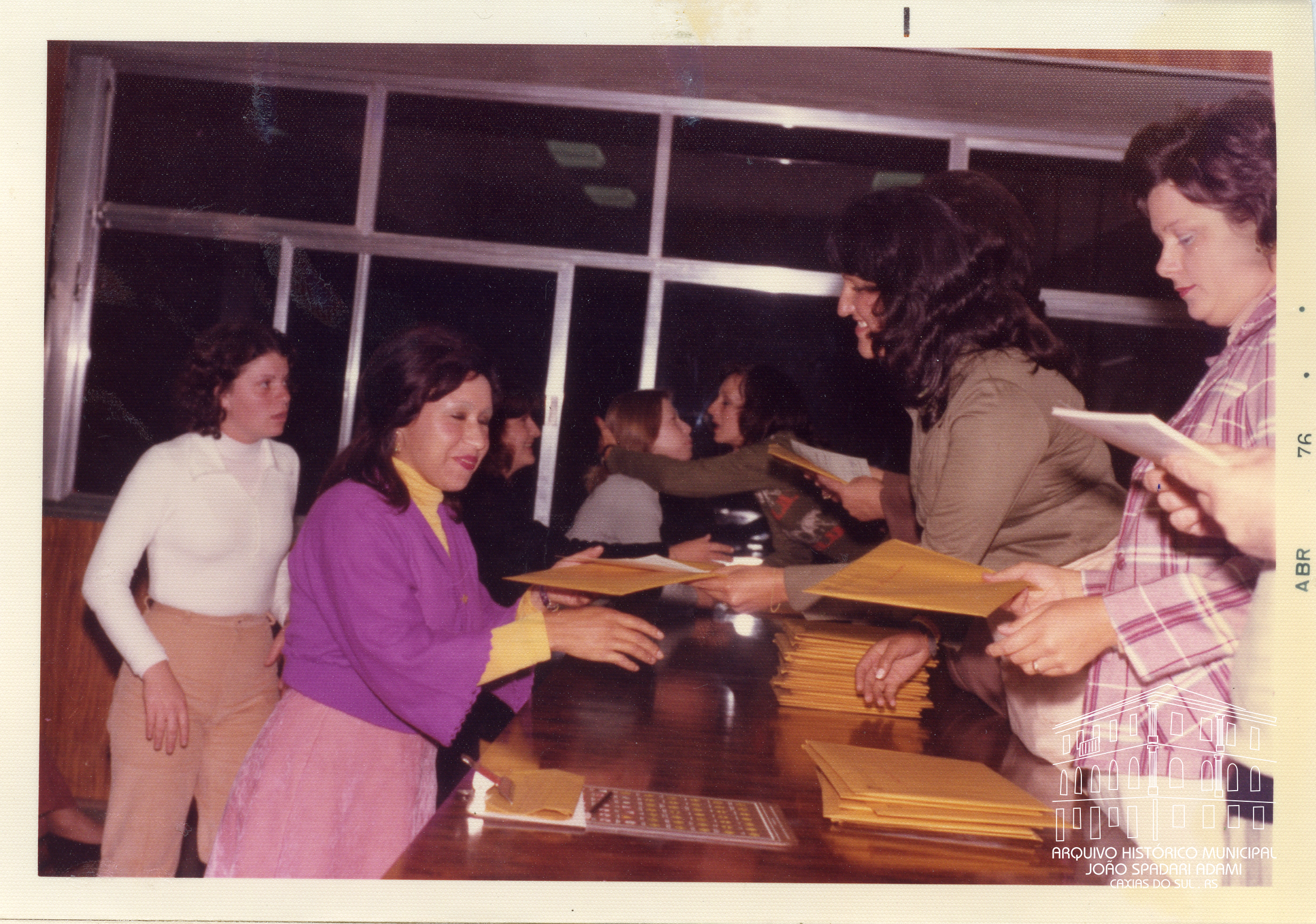 Entrega de certificados às professoras participantes do Curso de Recreação e Iniciação Esportiva no mês de abril de 1976.