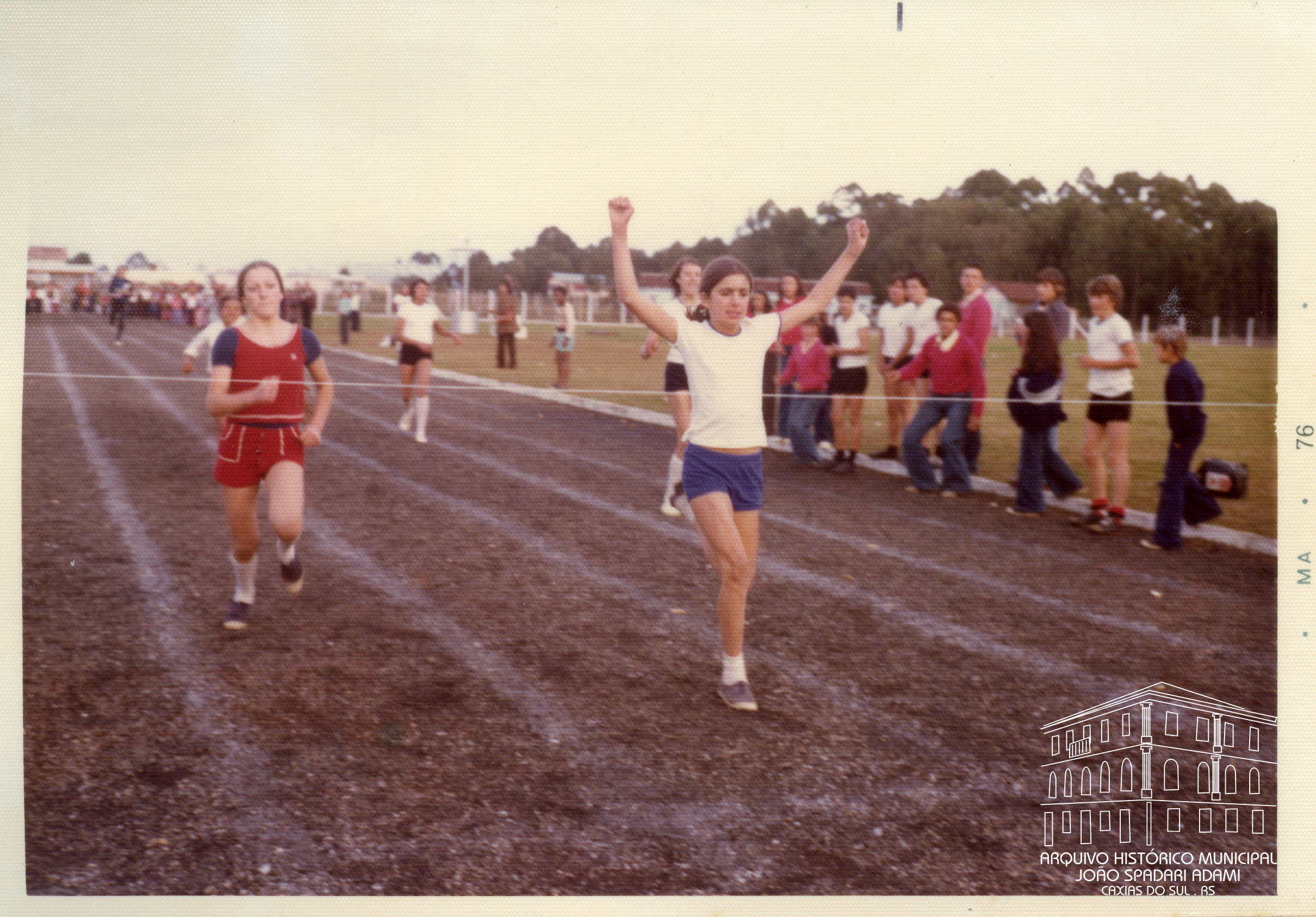 Alunas participantes da prova de corrida de velocidade do I Torneio Geral de Atletismo dos Grupos Escolares Municipais de Caxias do Sul, em 30 de março de 1976.