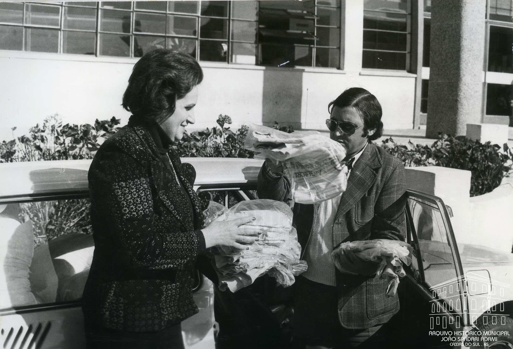 Santina Barp Amorin, Secretária Municipal da Educação, recebendo produtos da Malharia Montresul destinados aos Grupos Escolares carentes.