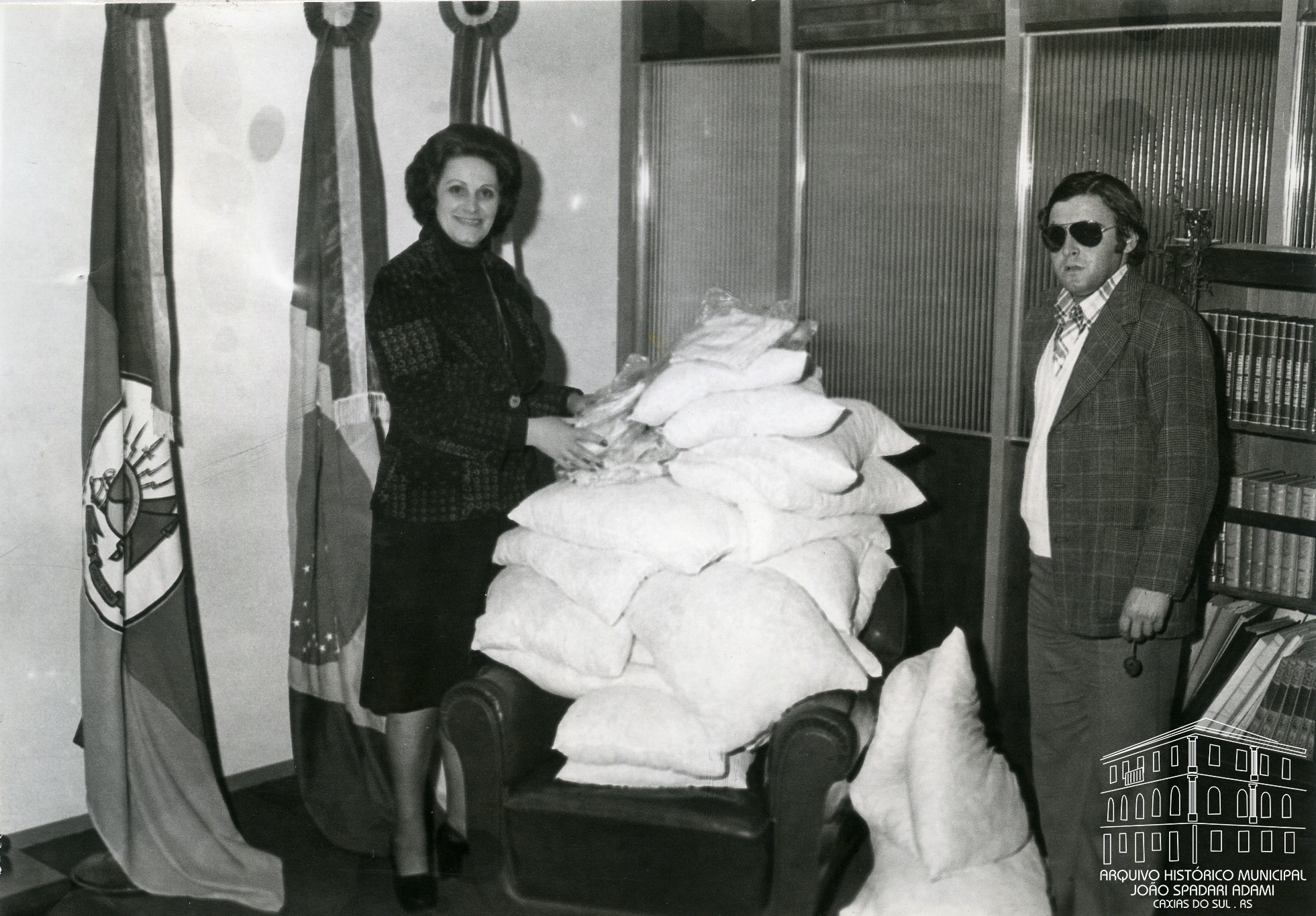 Santina Barp Amorin, Secretária Municipal da Educação, recebendo produtos da Malharia Montresul destinados aos Grupos Escolares carentes.