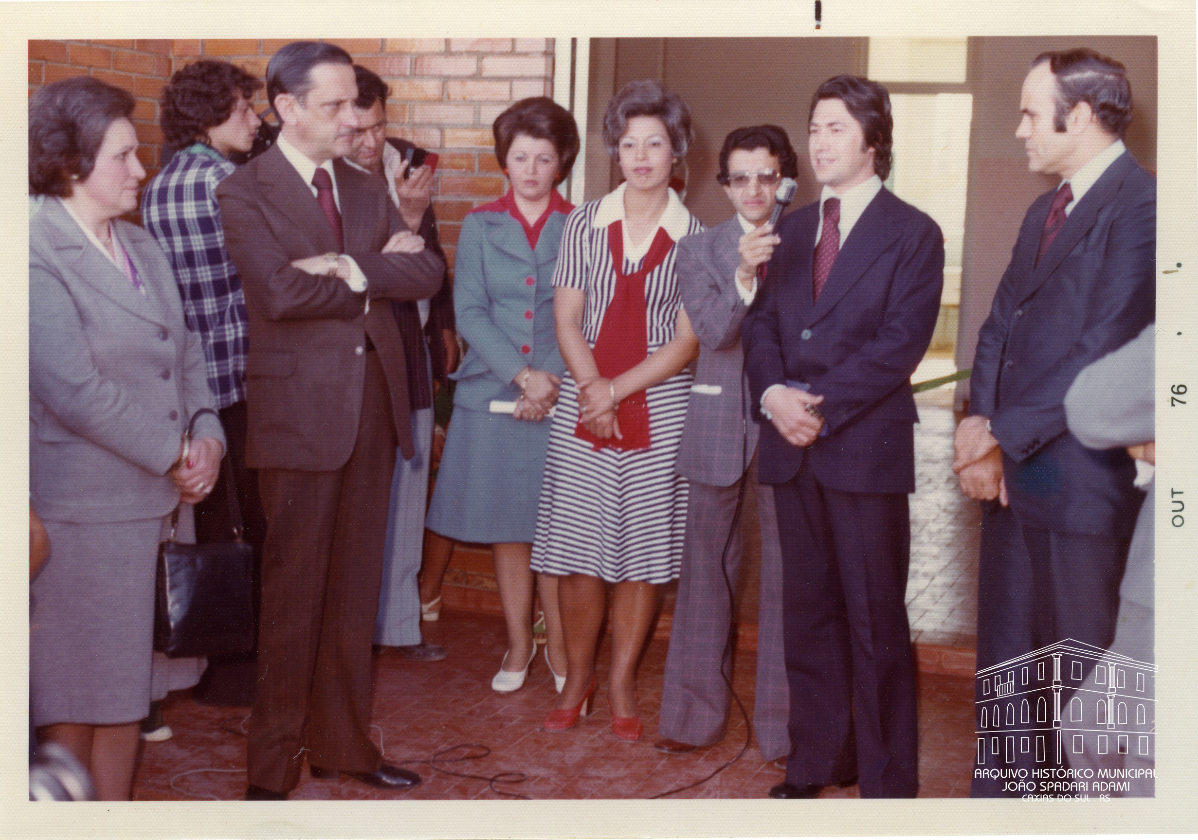 Ao microfone, Prefeito Mário David Vanin na inauguração do Grupo Escolar Angelina Sassi Comandulli, situado no bairro Santa Fé, no dia 22 de outubro de 1976. À esquerda Santina Barp Amorin, Secretária Municipal da Educação e, à direita, Governador do RS Synval Sebastião Duarte Guazzelli.