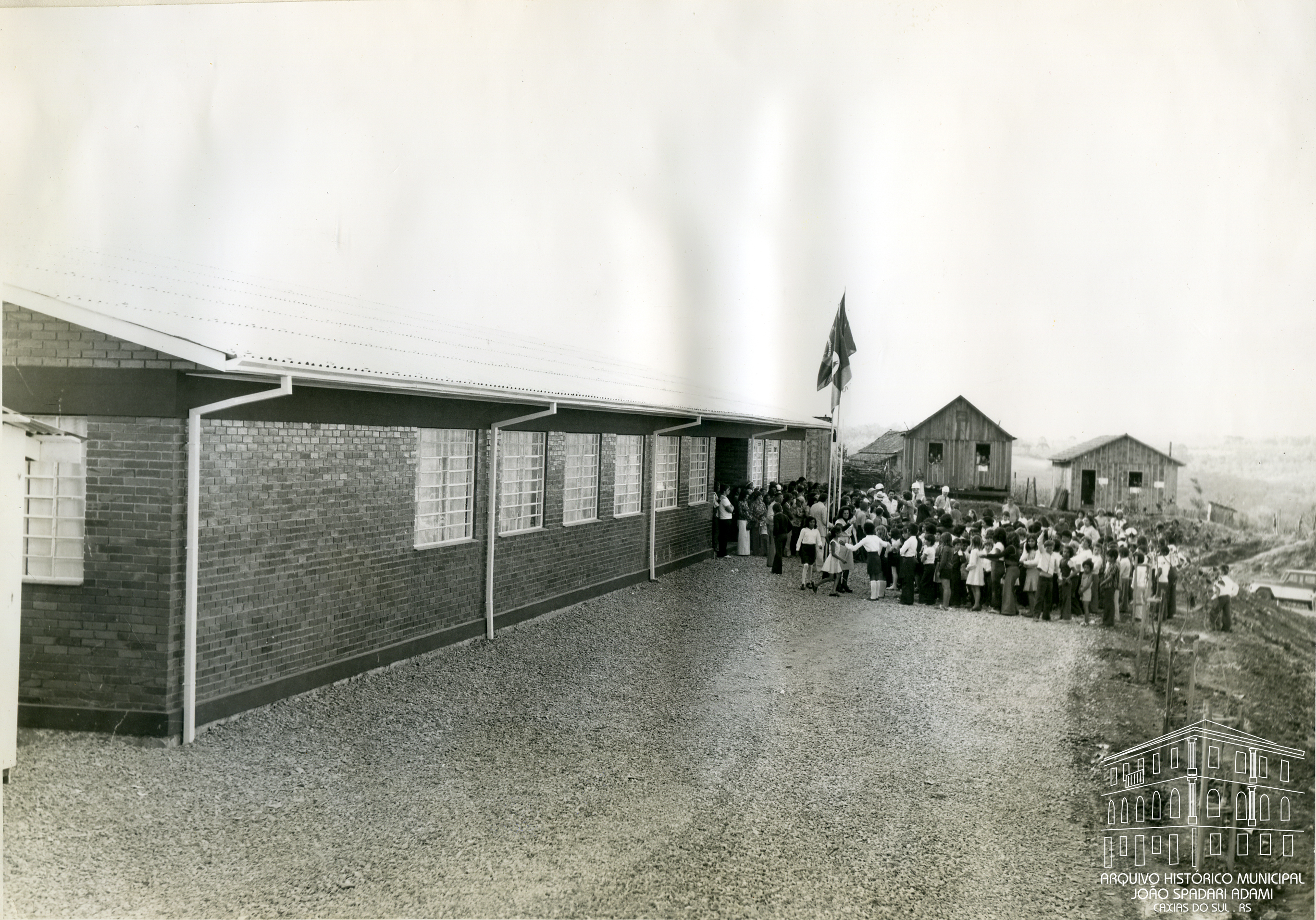 Autoridades e comunidade em frente ao prédio do Grupo Escolar Angelina Sassi Comandulli, situado no bairro Santa Fé, em 22 de outubro de 1976, data da inauguração.