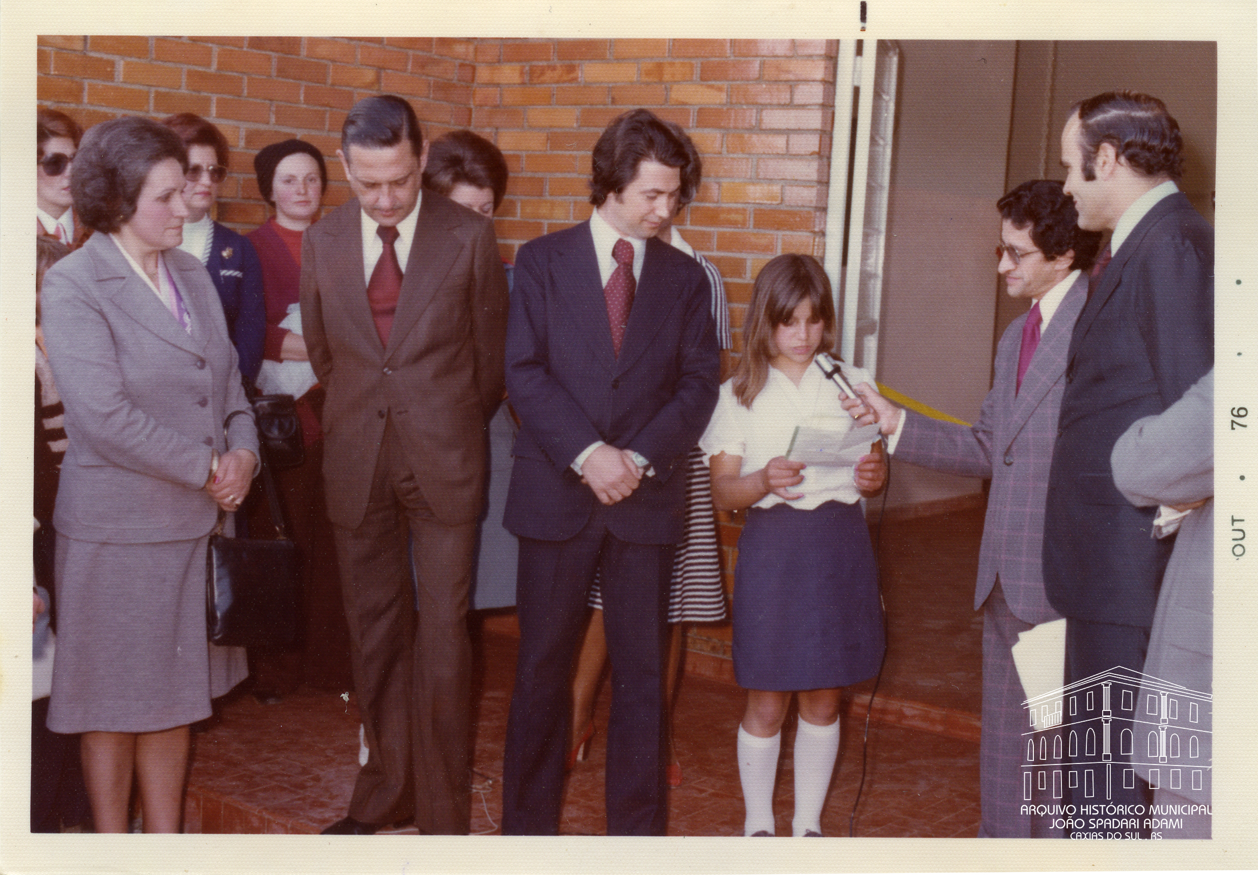 Aluna e autoridades na inauguração do Grupo Escolar Angelina Sassi Comandulli, situado no bairro Santa Fé, no dia 22 de outubro de 1976. À esquerda, Santina Barp Amorin, Secretária Municipal da Educação e, ao centro, Prefeito Mário David Vanin.