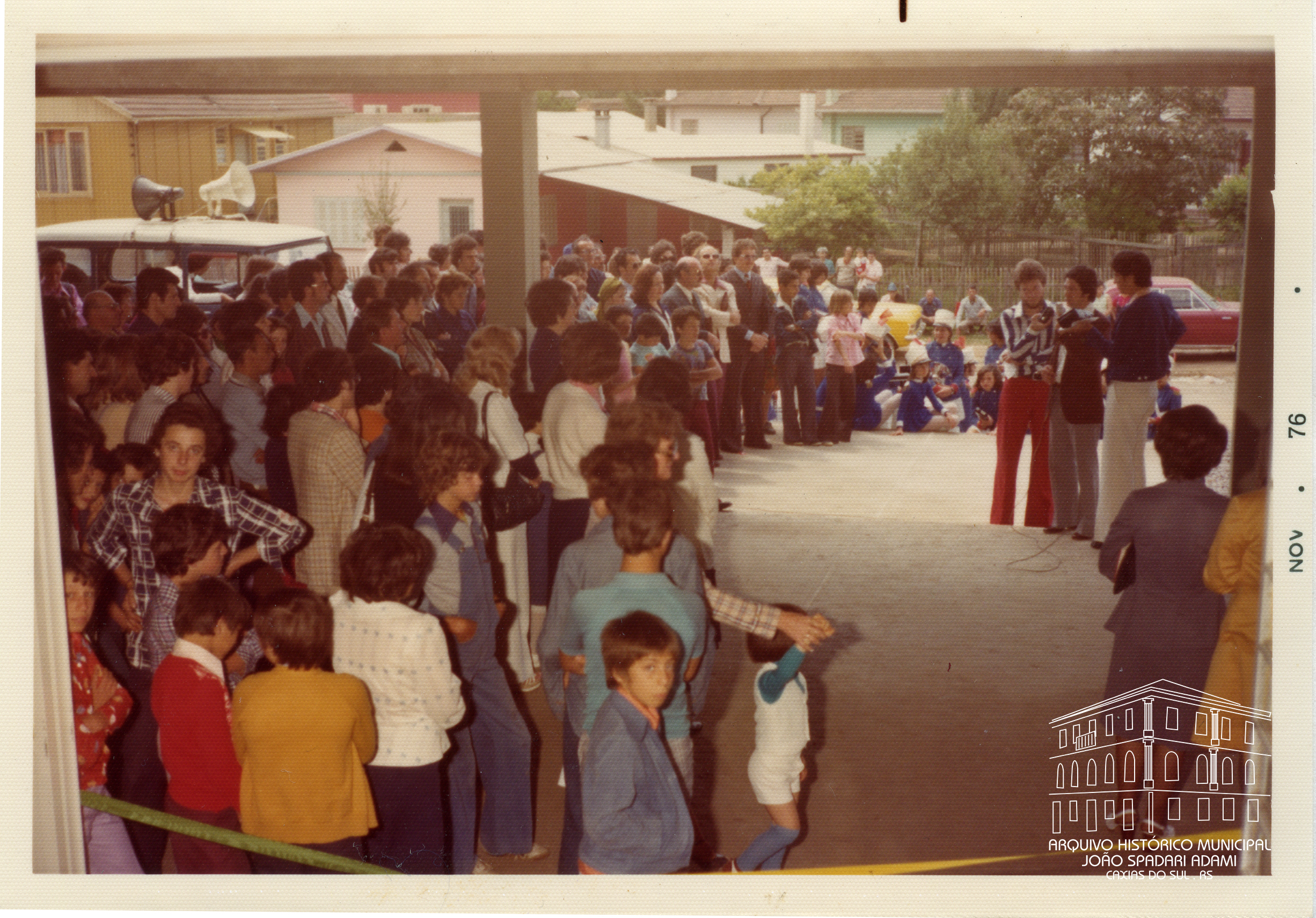 Ao microfone, Prefeito Mário David Vanin na inauguração da Escola Municipal Giusepe Garibaldi, situada na rua Silveira Martins, bairro Cristo Redentor, em 14 de novembro de 1976.