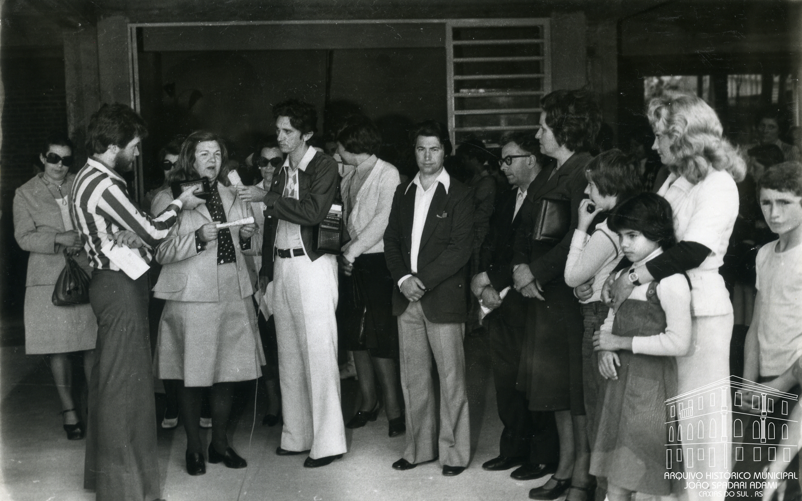 Inauguração da Escola Municipal Giusepe Garibaldi, situada na rua Silveira Martins, bairro Cristo Redentor, em 14 de novembro de 1976. Da esquerda para a direita, 4º Prefeito Mário David Vanin e 6ª Santina Barp Amorin, Secretária Municipal da Educação.Autoria: Não identificada