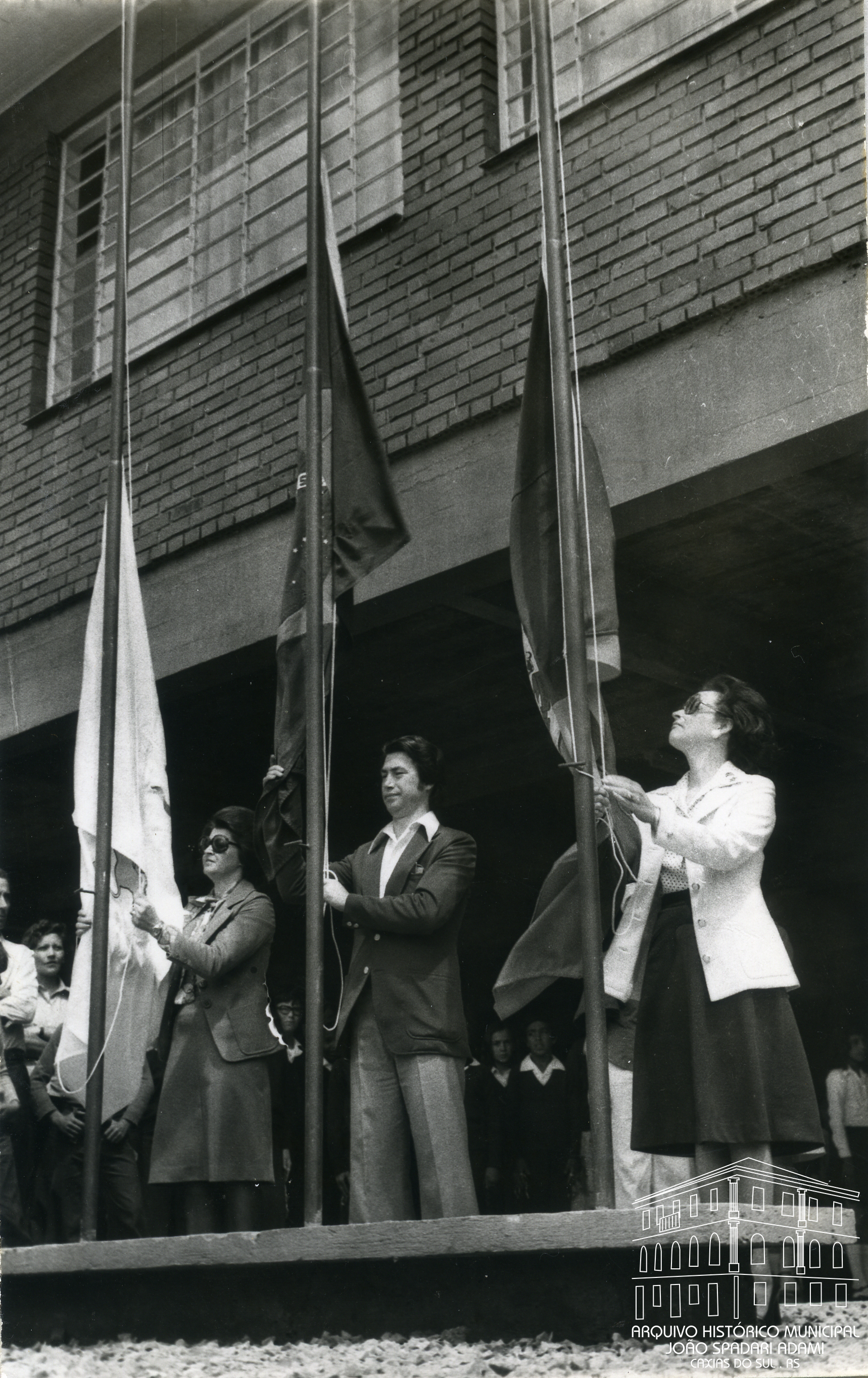 Hasteamento das Bandeiras na inauguração da Escola Municipal Giusepe Garibaldi, situada na rua Silveira Martins, bairro Cristo Redentor, em 14 de novembro de 1976. Ao centro, Prefeito Mário David Vanin.