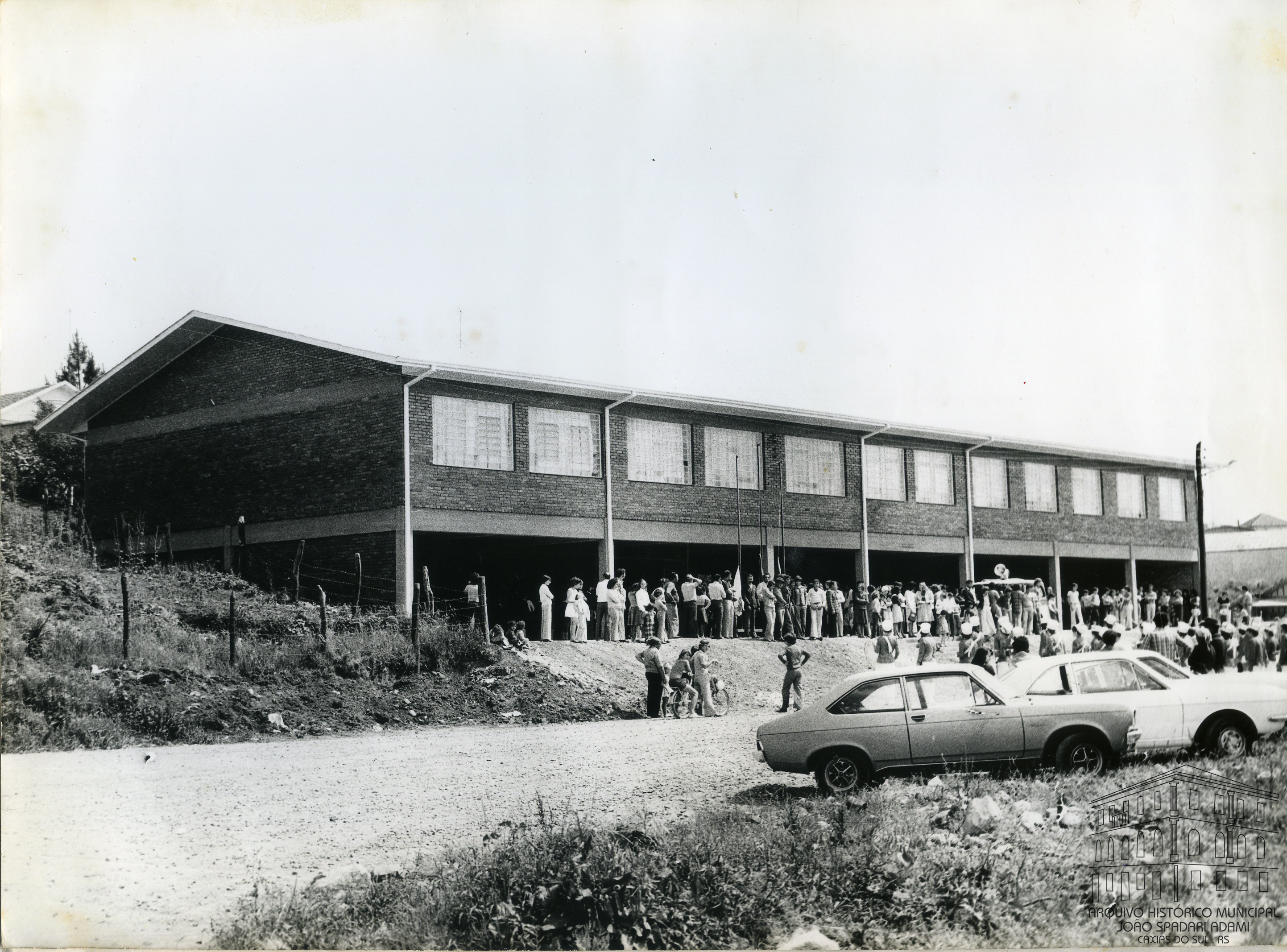 Autoridades e comunidade na inauguração da Escola Municipal Giusepe Garibaldi, situada na rua Silveira Martins, bairro Cristo Redentor, em 14 de novembro de 1976.