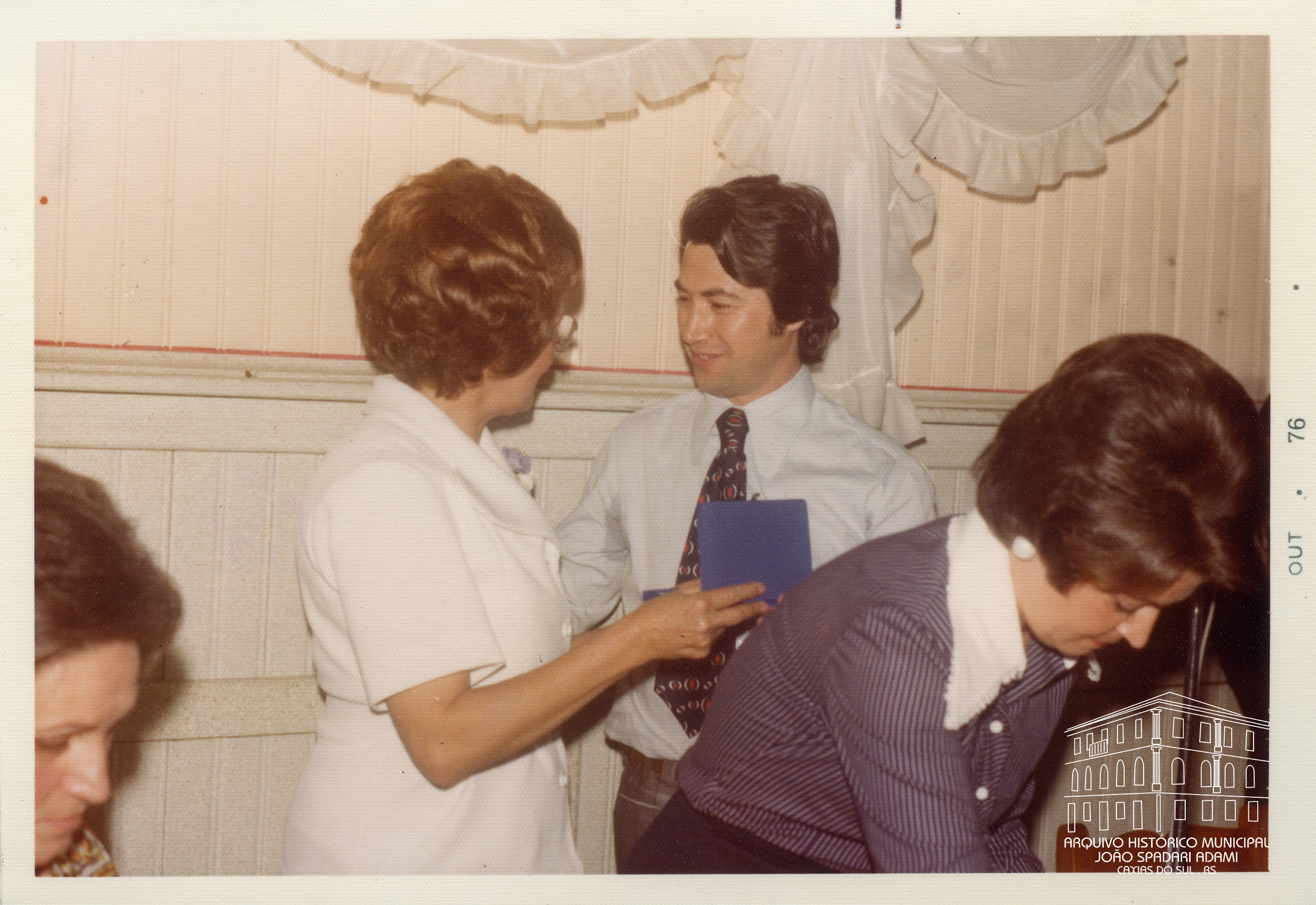 Prefeito Mário David Vanin entrega cartão de prata em homenagem à aposentadoria para a professora Matilde Brisotto, em 15 de outubro de 1976.