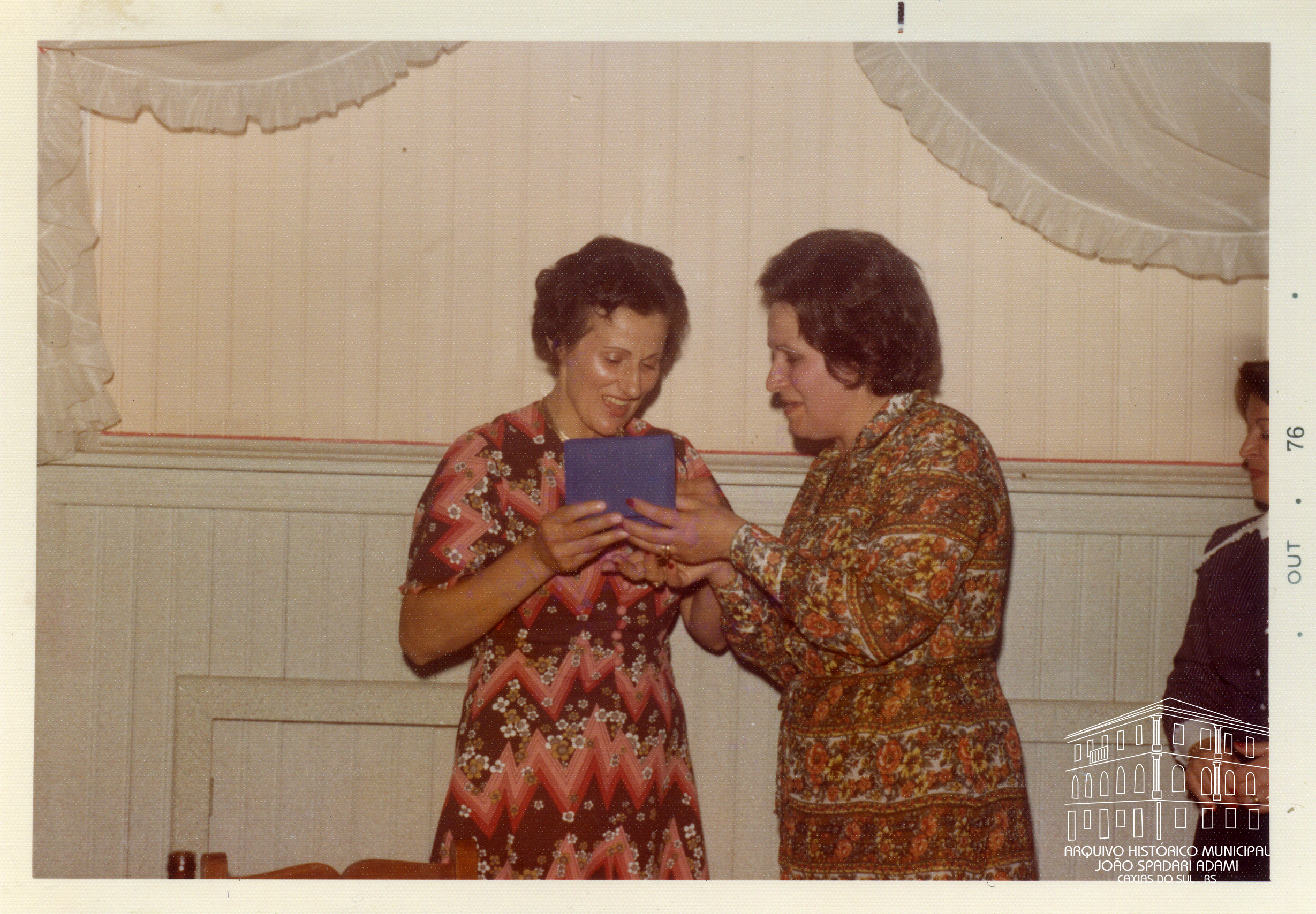 Santina Barp Amorin, Secretária Municipal da Educação, entrega cartão de prata em homenagem à aposentadoria para a professora Olina Madalosso Trentin, em 15 de outubro de 1976.
