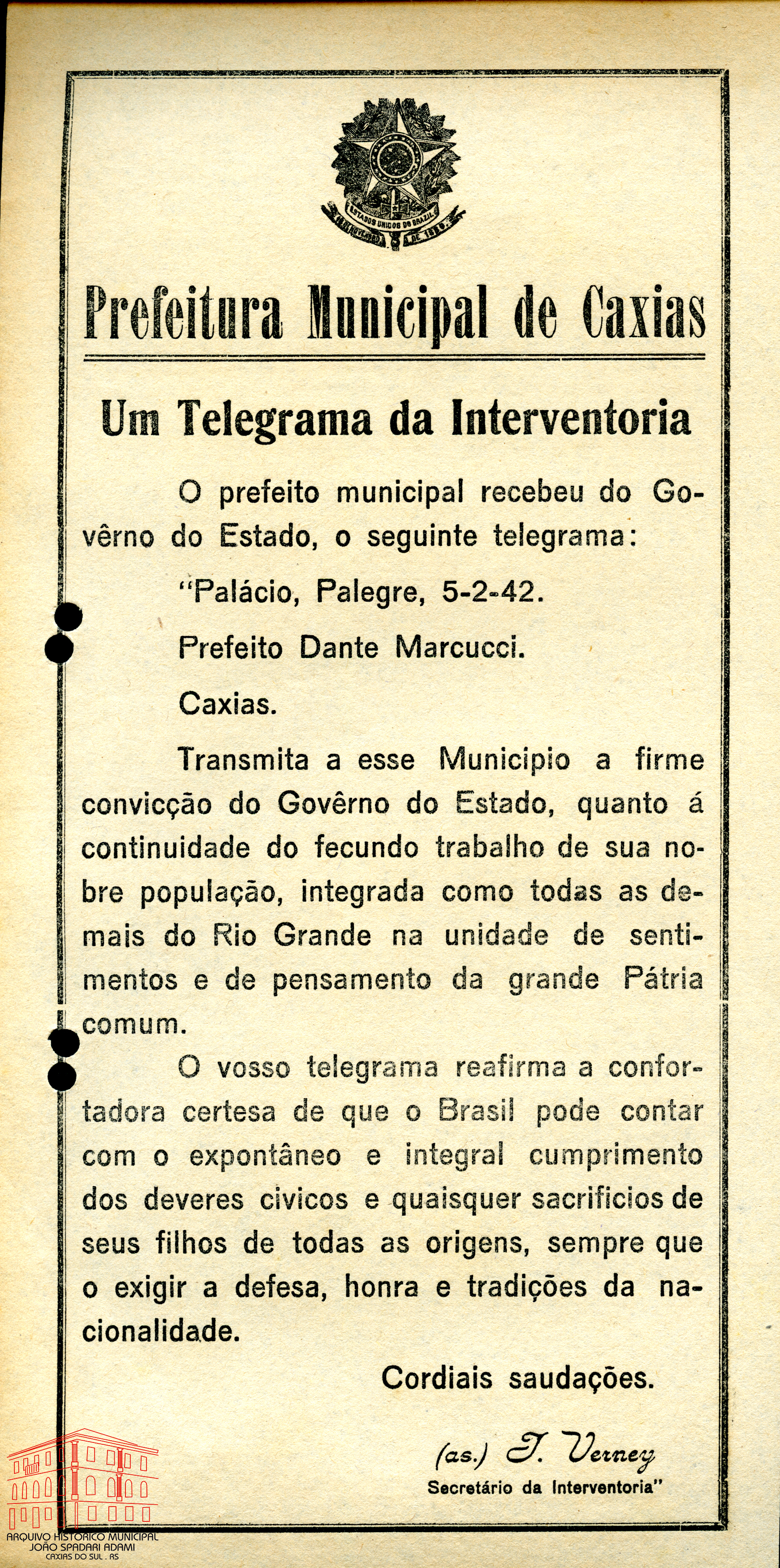 Folheto informativo contendo o teor do telegrama enviado pelo Secretário da Interventoria Estadual, Ibanez Verney, para o Prefeito de Caxias, Dante Marcucci.