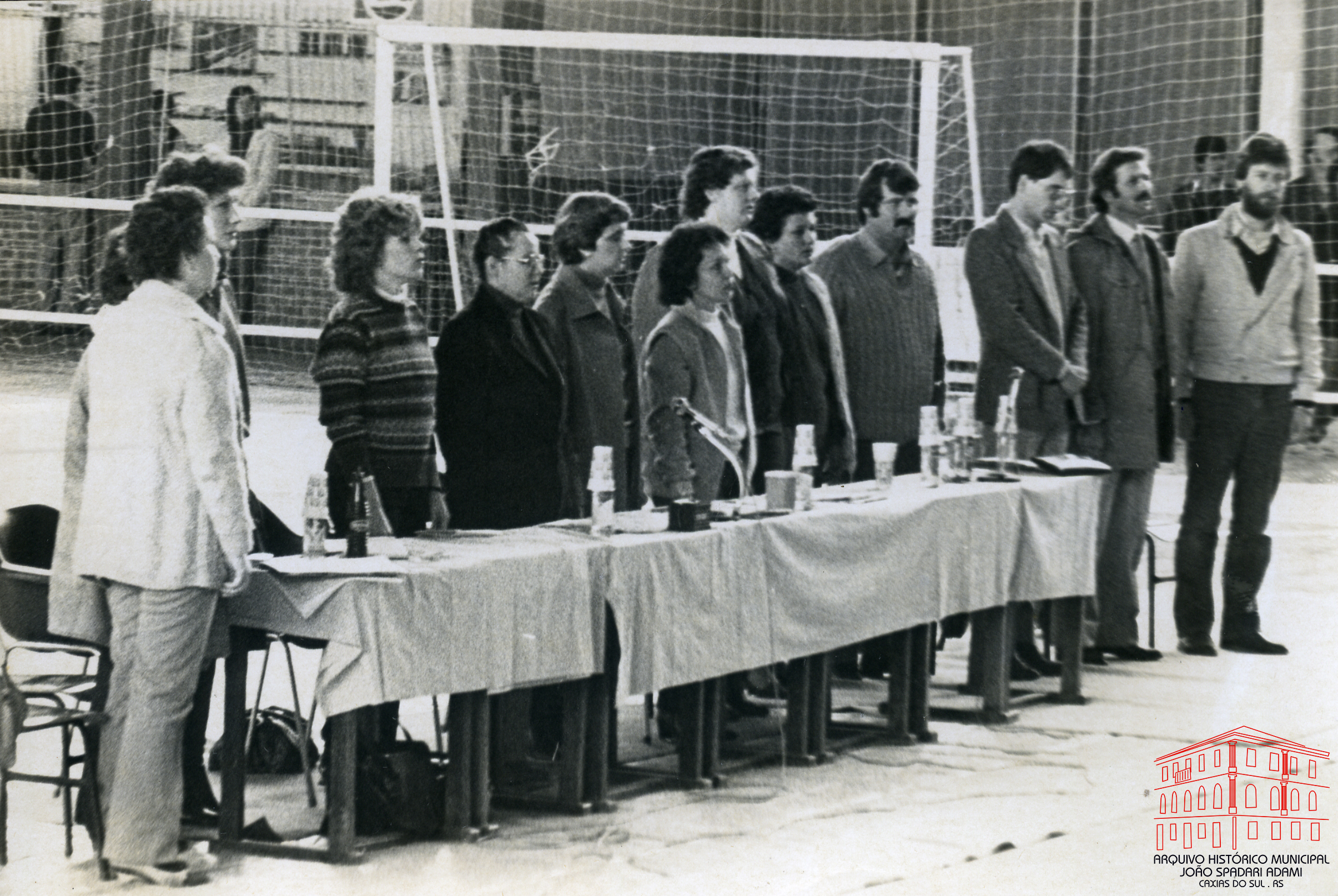 Autoridades compondo a mesa da Sessão Plenária do 1º Simpósio Municipal de Educação, no Ginásio de Esportes Pedro Carneiro Pereira. Da esquerda para a direita: 3ª Marta Gobbato Trez, Secretária Municipal de Educação e Cultura; 5ª Nelcy Rosa Casara; 10º José Carlos Monteiro.