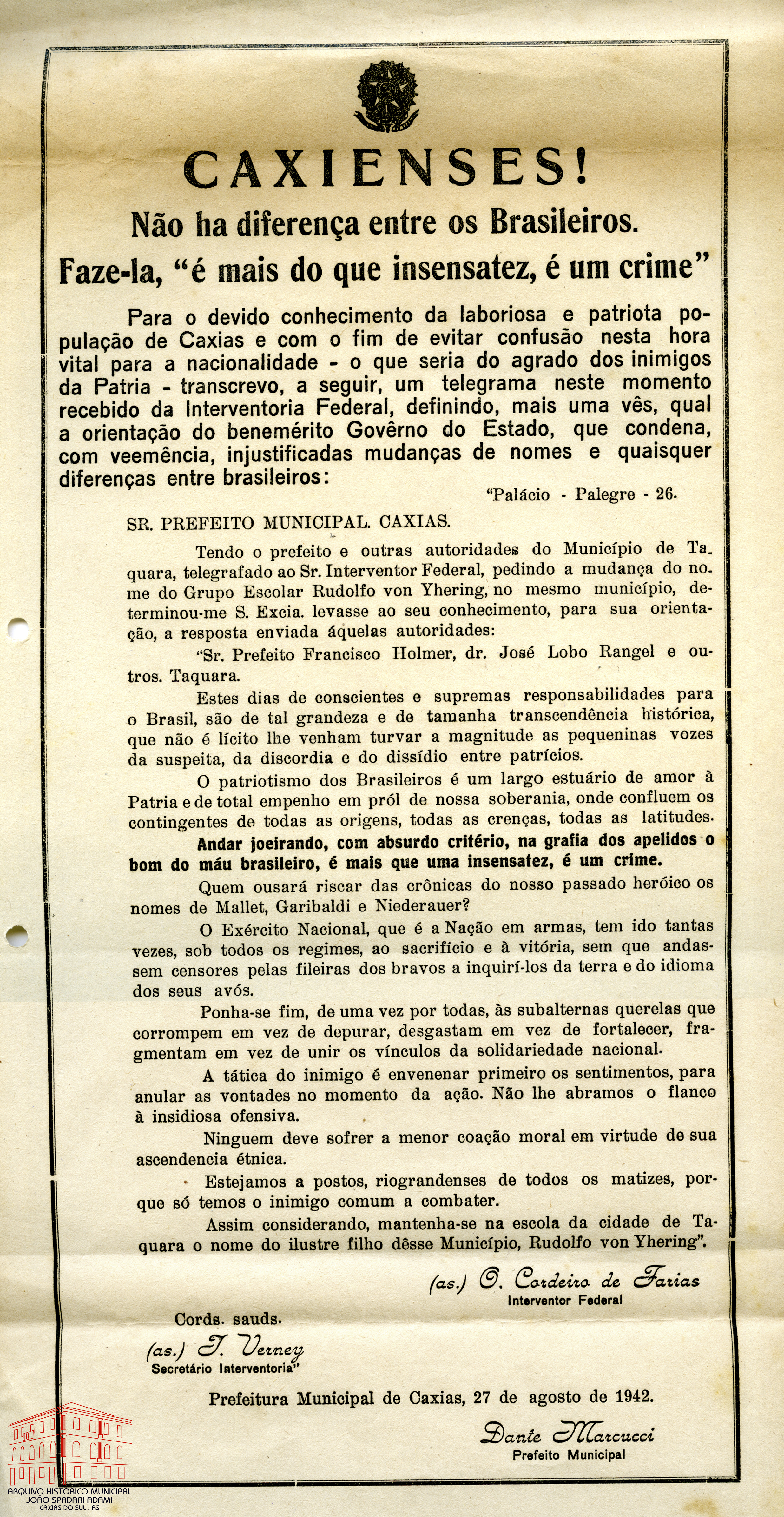Folheto informativo contendo transcrição de telegrama recebido da Interventoria Federal, com orientações condenando mudanças de nomes e diferenças entre brasileiros.