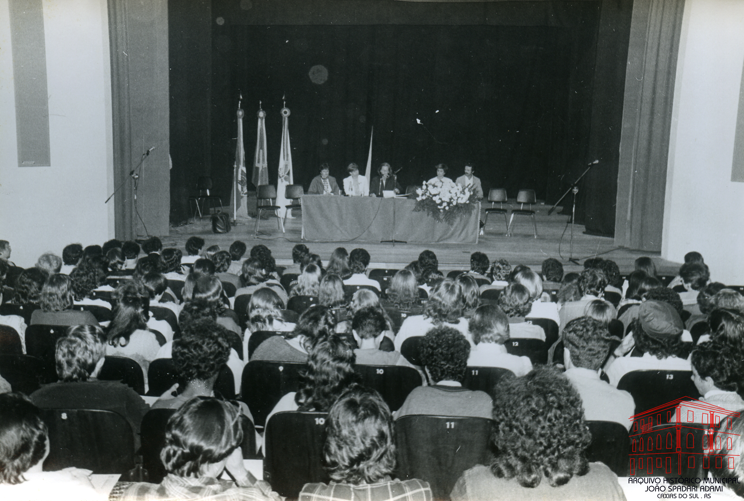 Ao microfone, professora da Universidade de Caxias do Sul, Corina Dotti, ministrando palestra “O Professor: Valorização e Competência”, no III Simpósio Municipal de Educação, realizado na Casa da Cultura Percy Vargas de Abreu e Lima, em 30 de maio de 1985.