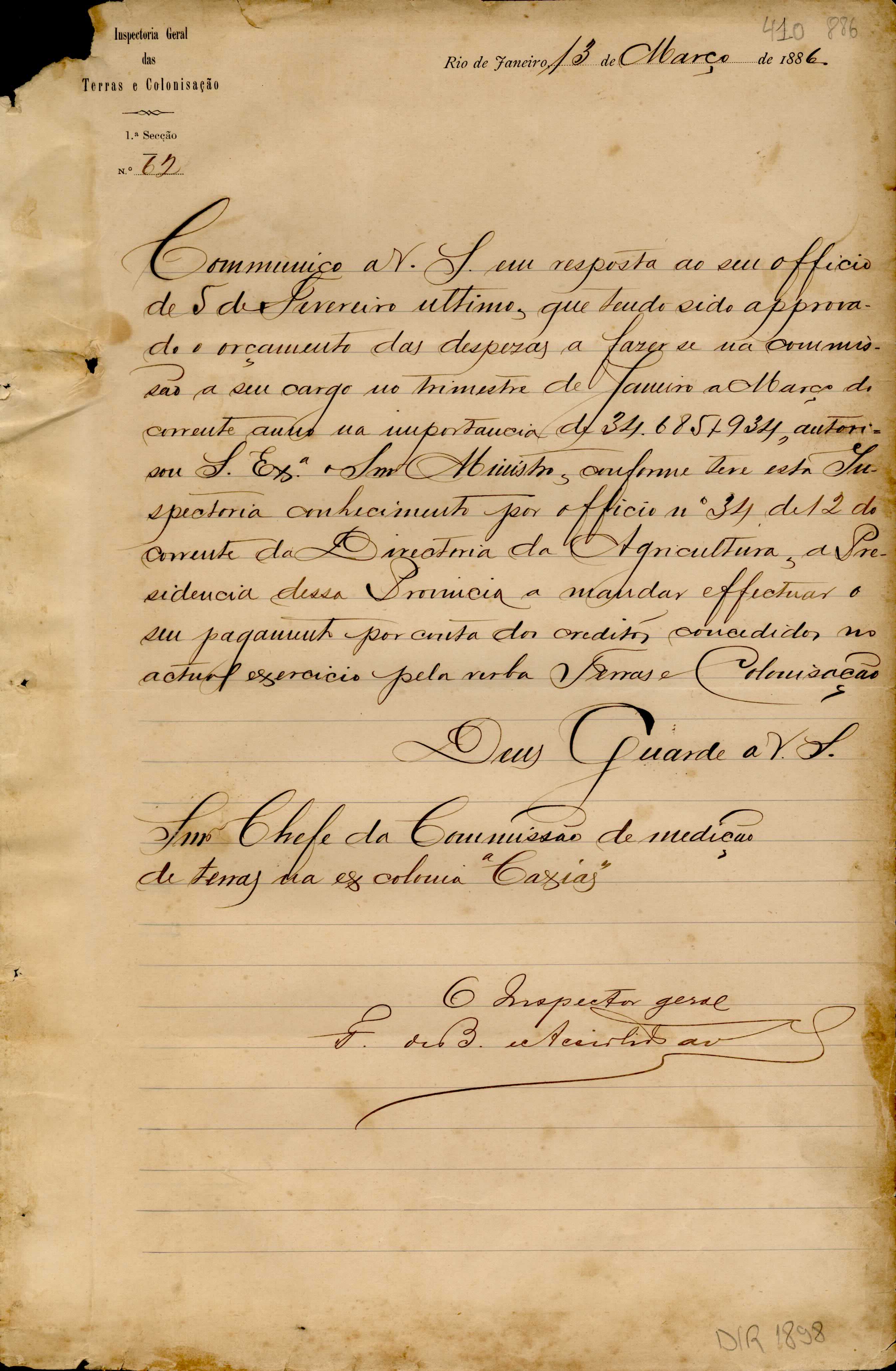 De Francisco de Barros e Accioli de Vasconcellos - Inspetor Geral das Terras e Colonização no RJ, para Manoel Barata Góes - Engenheiro Chefe de Medições na ex-Colônia Caxias. Assunto: comunica a autorização para o pagamento das despesas da Comissão no 1º trimestre de 1886.