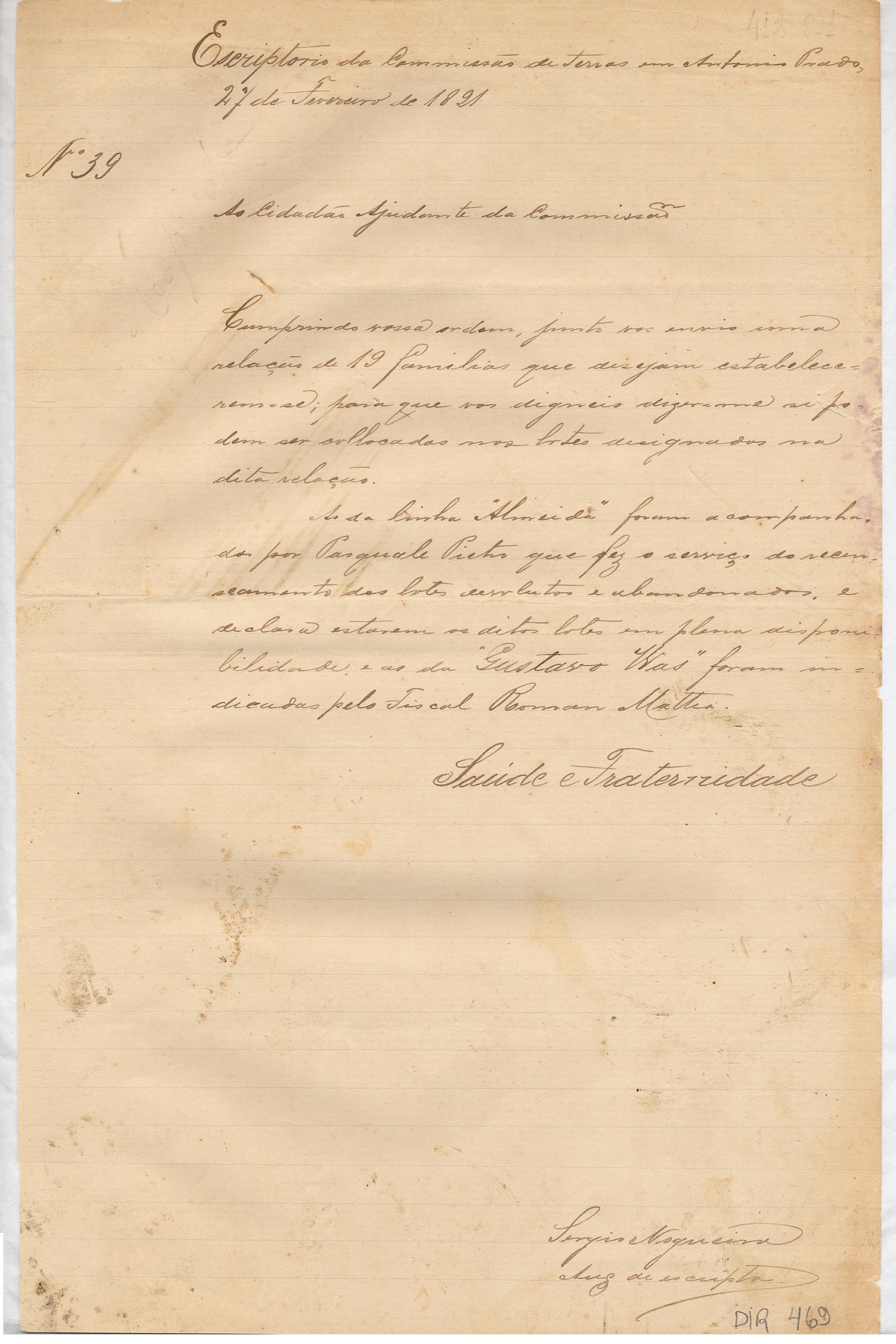 De Sérgio Nogueira - Auxiliar de Escrita da Comissão de Terras em Antonio Prado, para o Ajudante da Comissão. Assunto: comunica envio de relação de 19 famílias que desejam se estabelecer, solicitando serem colocadas nos lotes designados na relação.