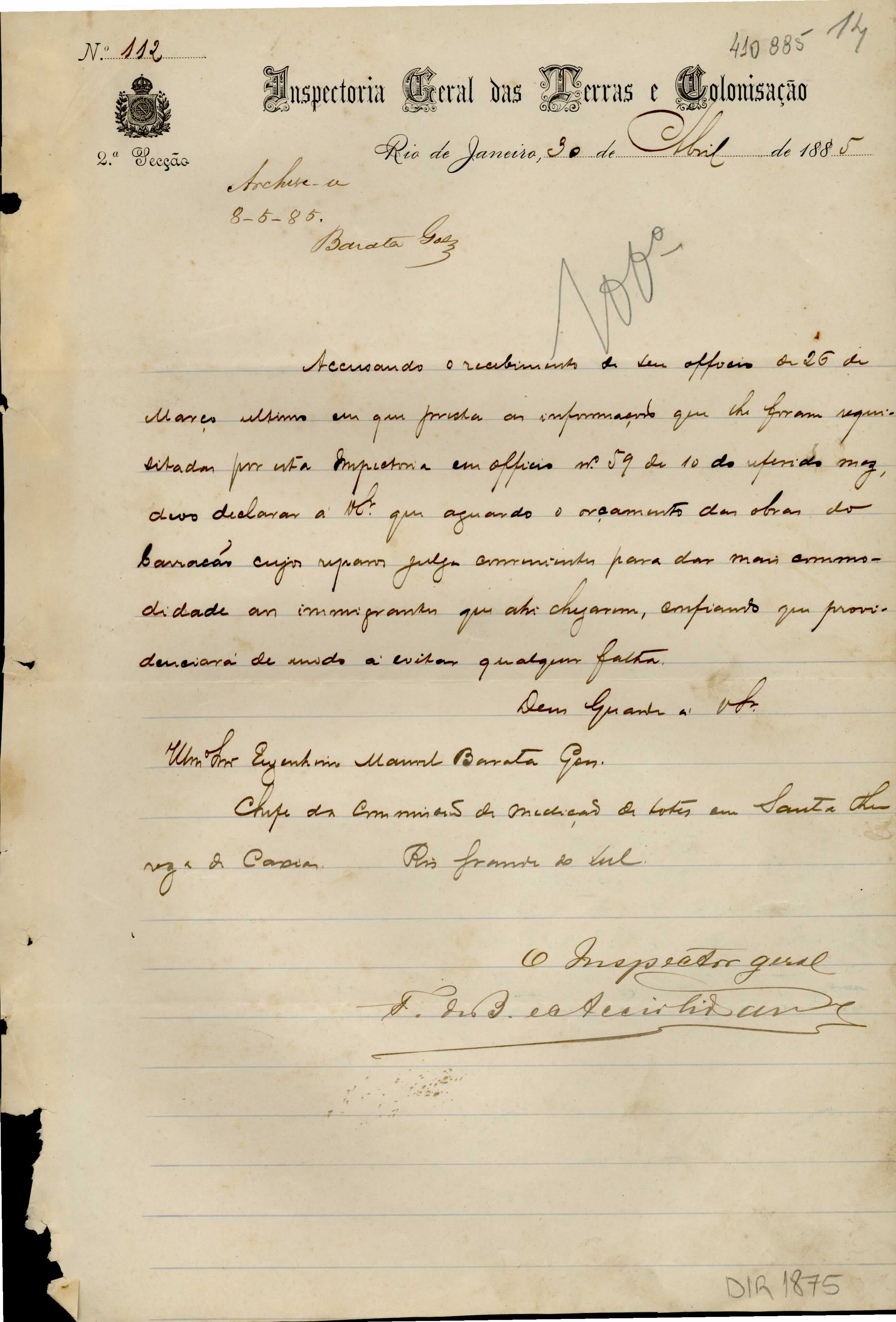 De Francisco de Barros e Accioli de Vasconcellos - Inspetor Geral das Terras e Colonização no RJ, para Manoel Barata Góes - Engenheiro Chefe de Medições na ex-Colônia Caxias. Assunto: comunica recebimento de ofício; solicita orçamento das obras do barracão.