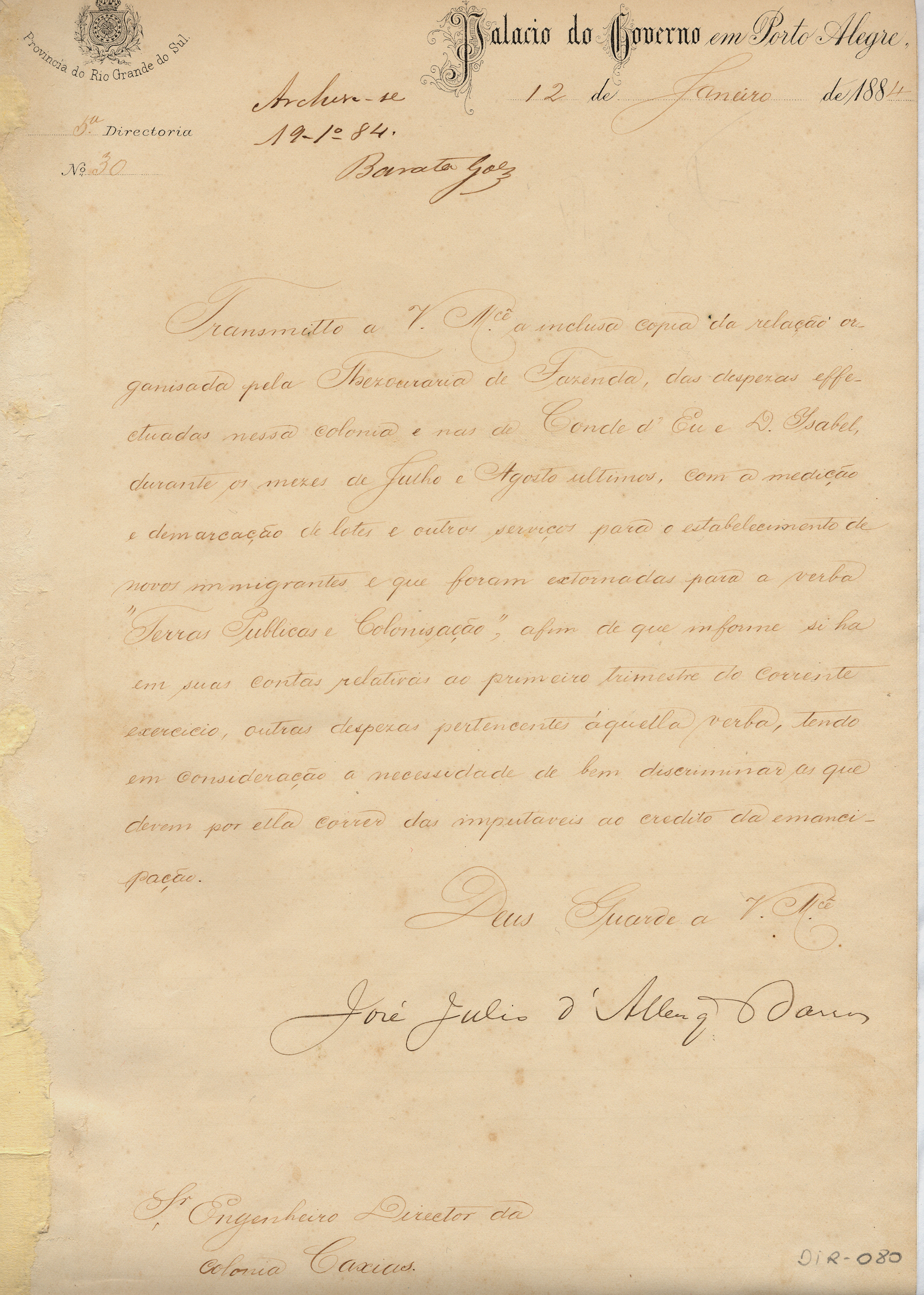 Do Palácio do Governo - 5ª Diretoria - José Júlio de Albuquerque Barros, para o Engenheiro Diretor da Colônia Caxias. Assunto: transmite relação das despesas das colônias Caxias, Conde D'Eu e D. Isabel de julho e agosto, com medição e demarcação de lotes e outros serviços de imigração, para revisão das contas. Local: Porto Alegre.