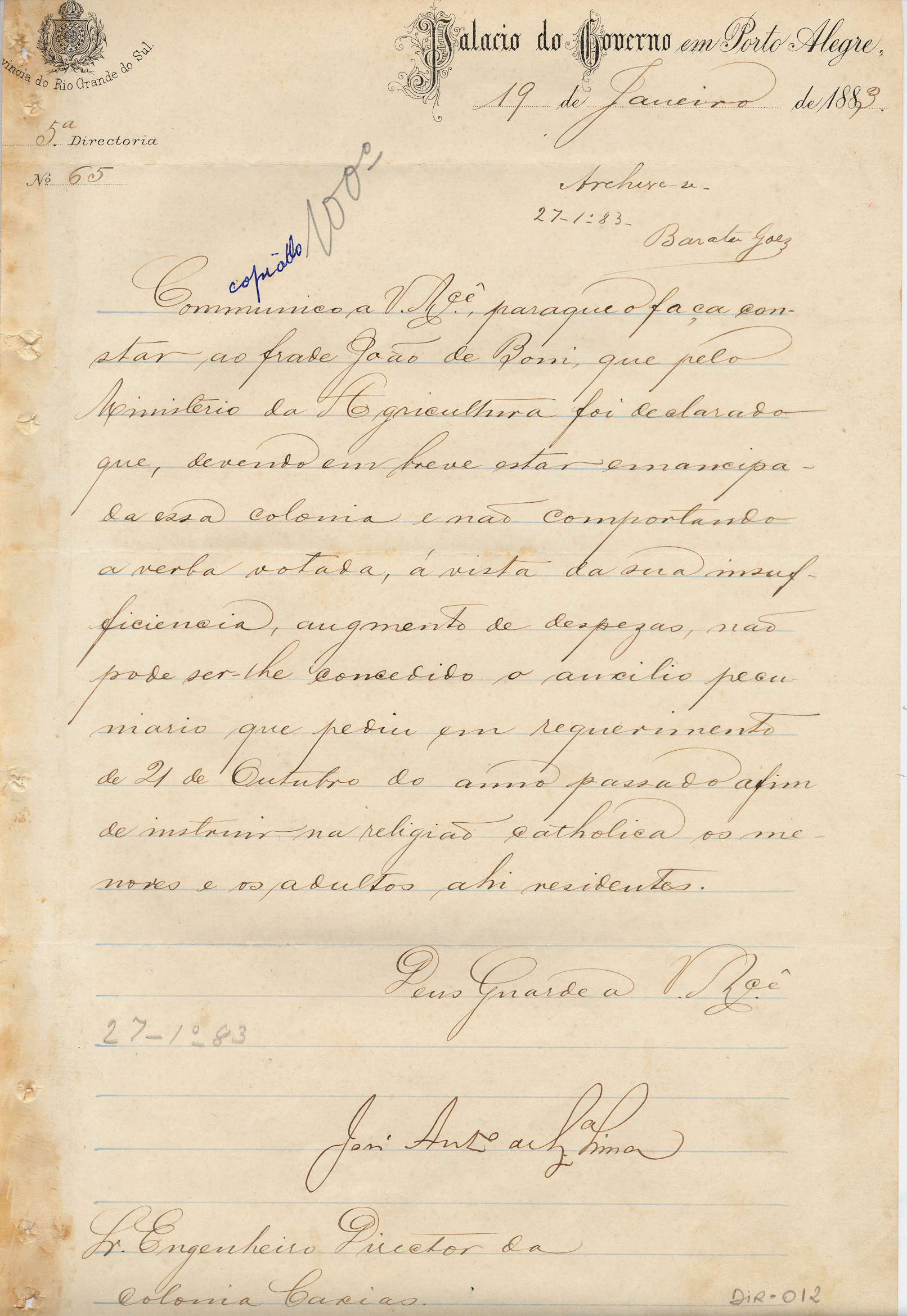 Do Palácio do Governo - 5ª Diretoria - Sr. José Antonio de S. Lima, para o Engenheiro Diretor da Colônia Caxias. Assunto: negação do pedido de auxílio pecuniário requerido pelo frade João de Boni, para instruir a religião católica. Local: Porto Alegre.
