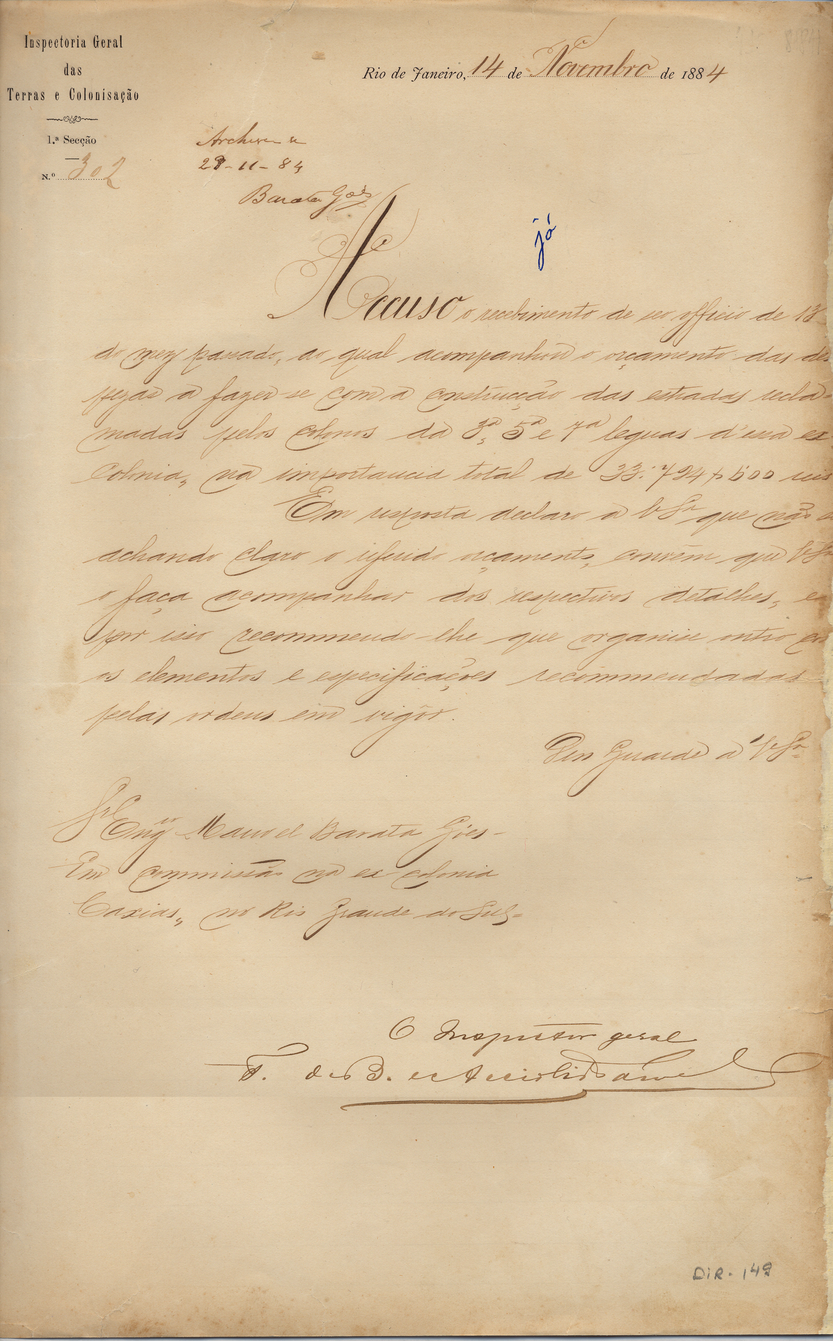 Da Inspetoria Geral das Terras e Colonização - 1ª seção - Francisco de Barros e Accioli de Vasconcellos - Inspetor Geral, para o Engenheiro Manoel Barata Góes - Chefe da Comissão. Assunto: solicita o envio de novo orçamento mais detalhado, para a construção de estradas.