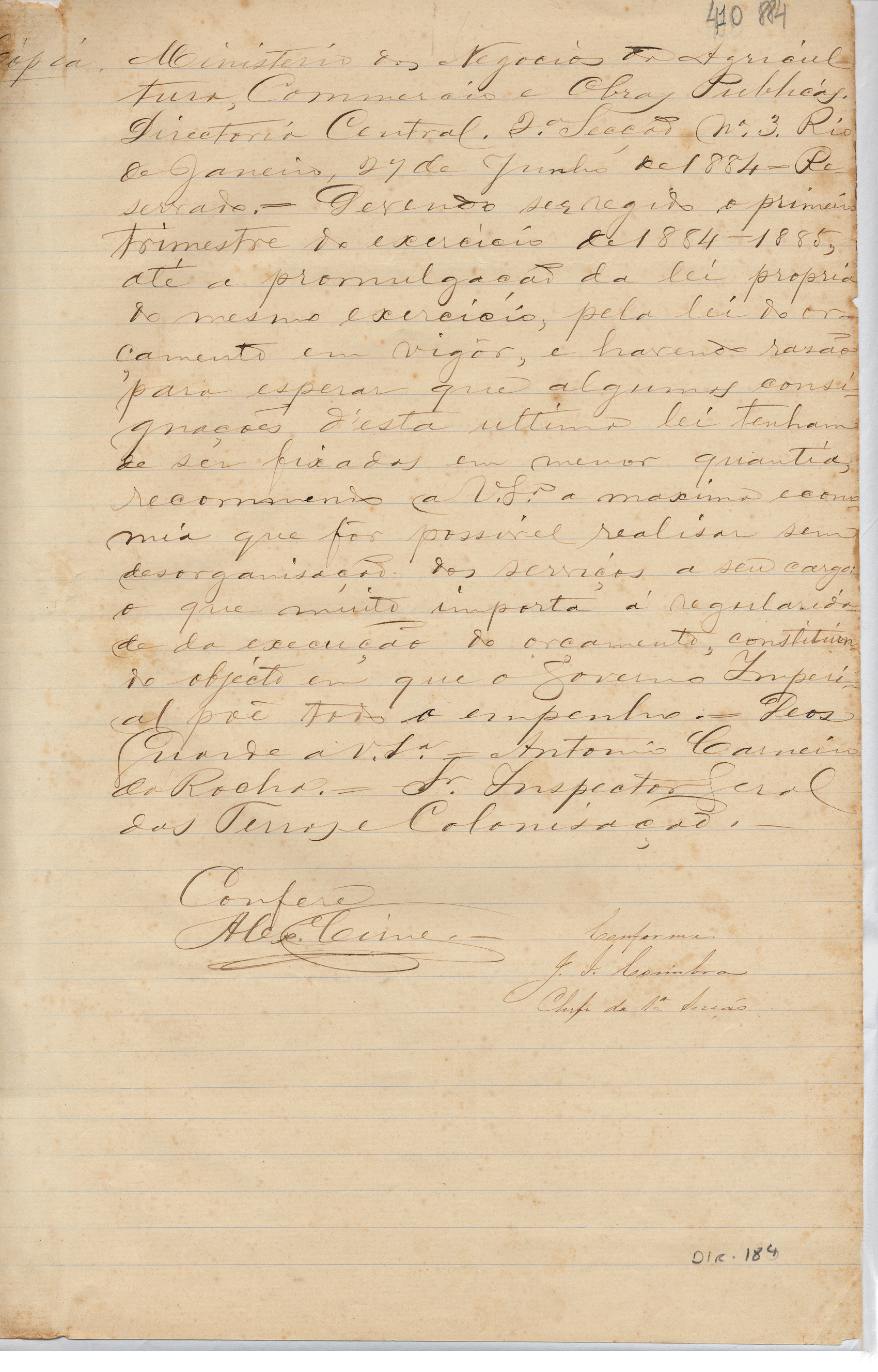 Do Ministério dos Negócios da Agricultura, Comércio e Obras Públicas - Diretoria da Agricultura no Rio de Janeiro, para o Inspetor Geral das Terras e Colonização - Antonio Carneiro da Rocha. Assunto: comunica regulamentação do orçamento e pedido de economia.