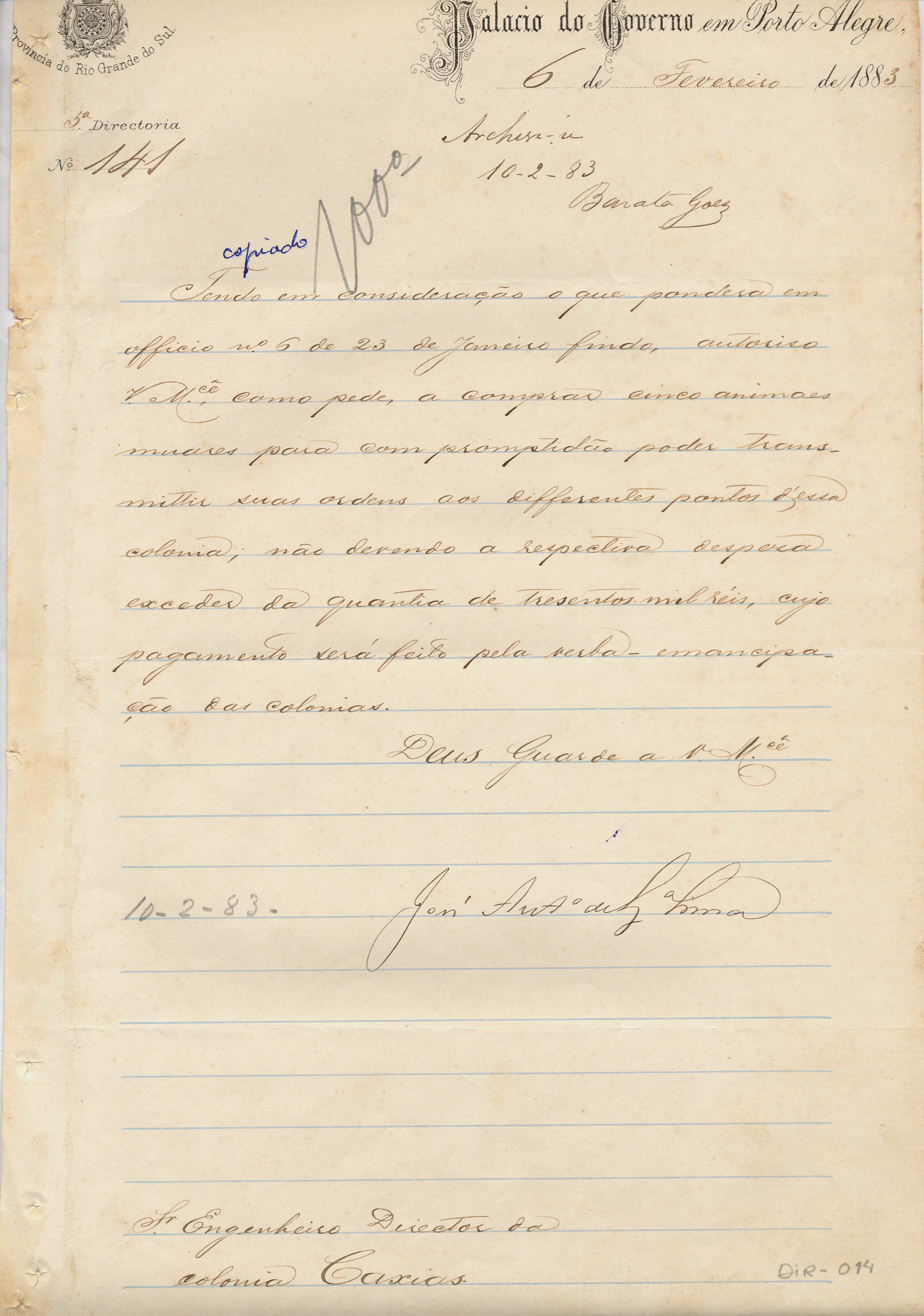 Do Palácio do Governo - 5ª Diretoria - Sr. José Antonio de S. Lima, para o Engenheiro Diretor da Colônia Caxias. Assunto: autorização para compra de mulas, que servirão de comunicação entre os pontos da colônia. Local: Porto Alegre.