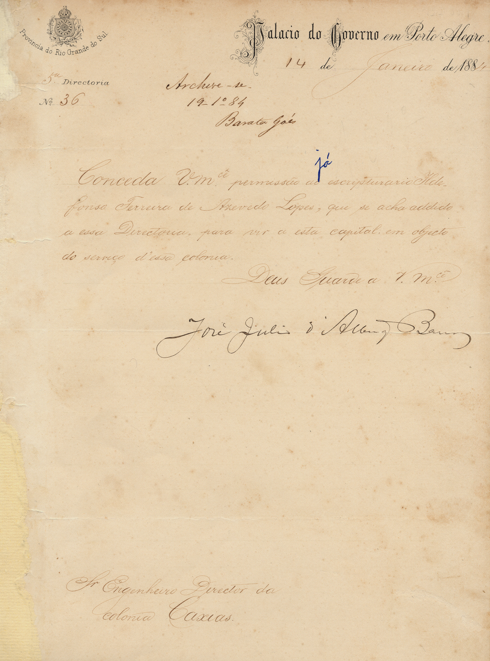 Do Palácio do Governo - 5ª Diretoria - José Júlio de Albuquerque Barros, para o Engenheiro Diretor da Colônia Caxias. Assunto: solicita permissão para o escriturário Ildefonso Ferreira de Azevedo Lopes ir a capital tratar do serviço da colônia. Local: Porto Alegre.