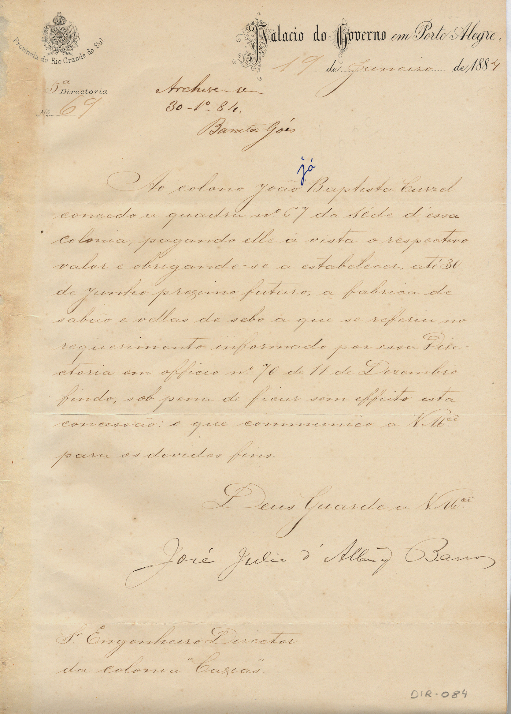 Do Palácio do Governo - 5ª Diretoria - José Júlio de Albuquerque Barros, para o Engenheiro Diretor da Colônia Caxias. Assunto: comunica concessão da quadra nº 67 da sede da colônia ao colono João Baptista Curzel, que fica comprometido a estabelecer até 30 de junho uma fábrica de sabão e velas de sebo. Local: Porto Alegre.