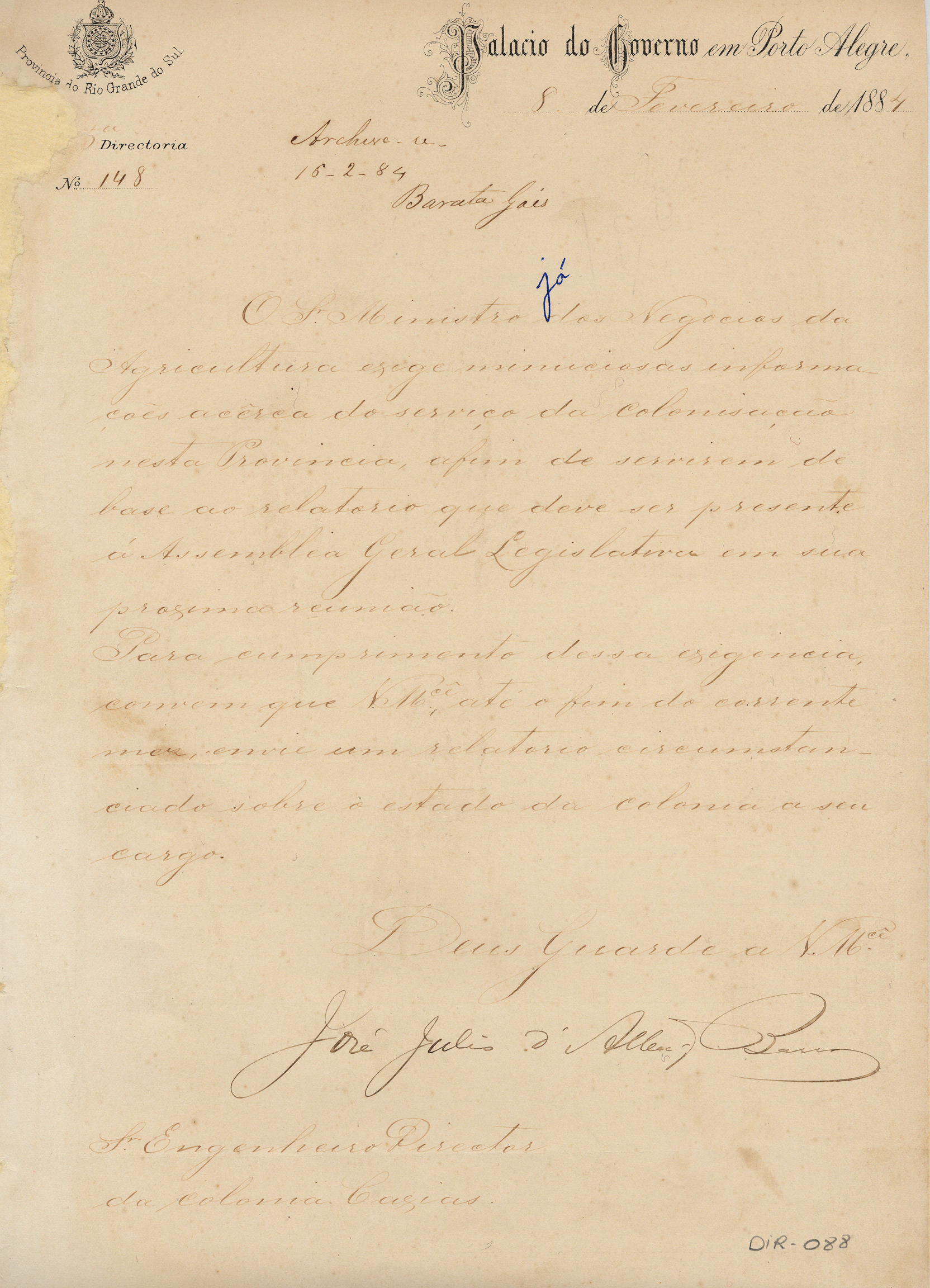 Do Palácio do Governo - 5ª Diretoria - José Júlio de Albuquerque Barros, para o Engenheiro Diretor da Colônia Caxias. Assunto: solicitação de relatório circunstanciado sobre o estado da colônia, cujas informações minuciosas servirão de base ao relatório a ser apresentado para a Assembleia Geral Legislativa. Local: Porto Alegre.