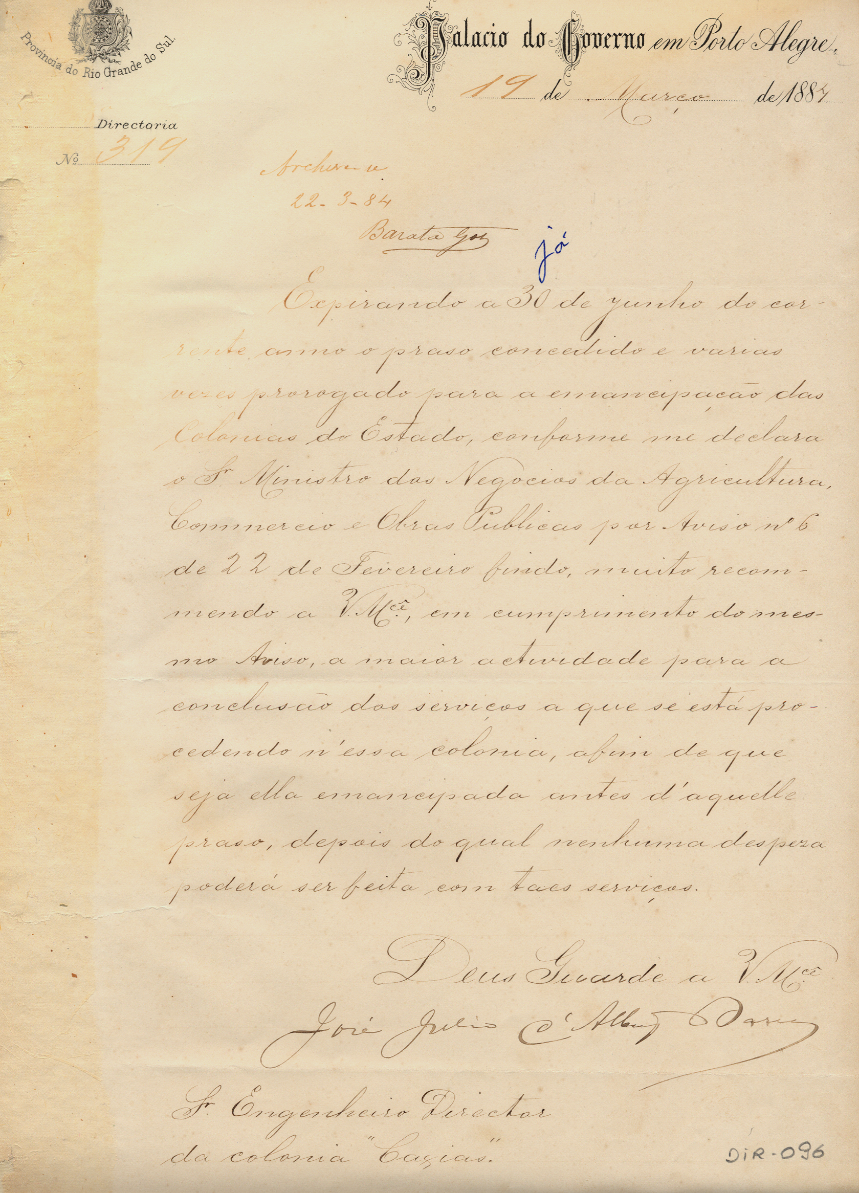 Do Palácio do Governo - 5ª Diretoria - José Júlio de Albuquerque Barros, para o Engenheiro-Chefe Diretor da Colônia Caxias. Assunto: solicita agilização dos serviços com a emancipação da colônia para serem concluídos antes do final do prazo. Local: Porto Alegre.