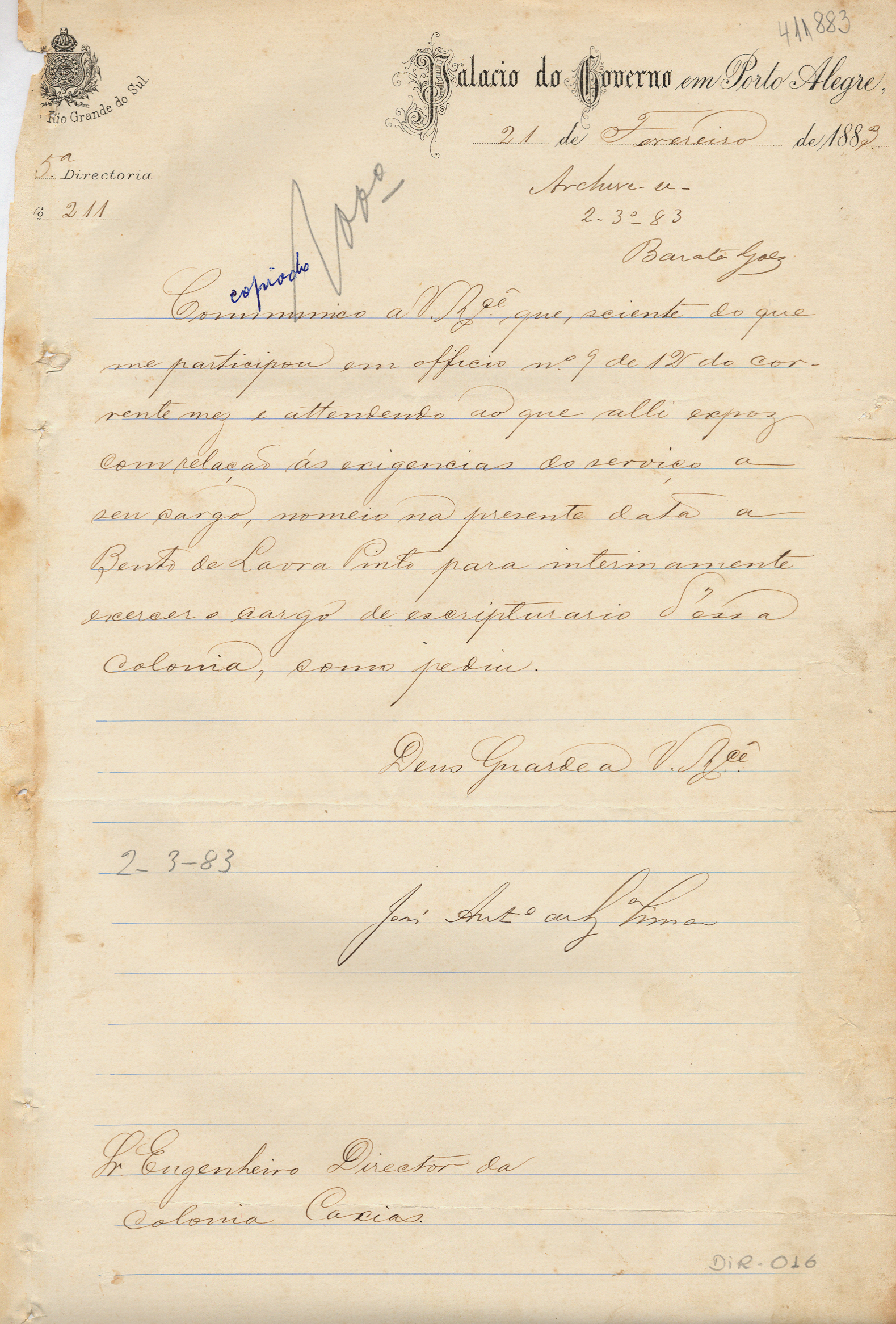 Do Palácio do Governo - 5ª Diretoria - Sr. José Antonio de S. Lima, para o Engenheiro Diretor da Colônia Caxias. Assunto: nomeação de Bento de Lavra Pinto para o cargo de Escriturário da Colônia. Local: Porto Alegre.