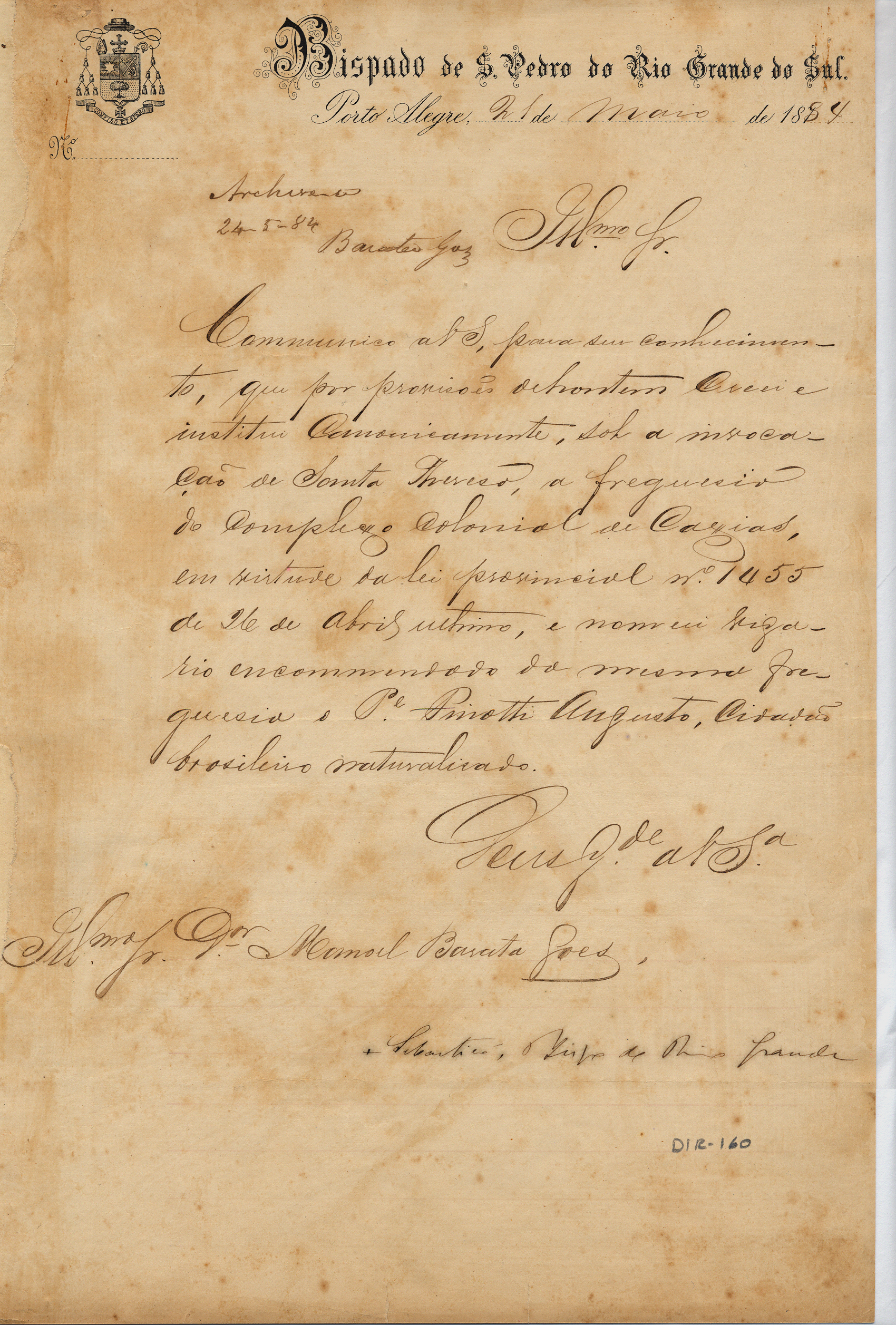 Do Bispado de São Pedro do Rio Grande do Sul - Padre Sebastião - Bispo de Rio Grande, para o Sr. Manoel Barata Góes - Diretor da Colônia Caxias. Assunto: comunica criação e instituição canônica da freguesia da Colônia Caxias; nomeação do padre Augusto Finotti para vigário (freguesia de Santa Tereza).