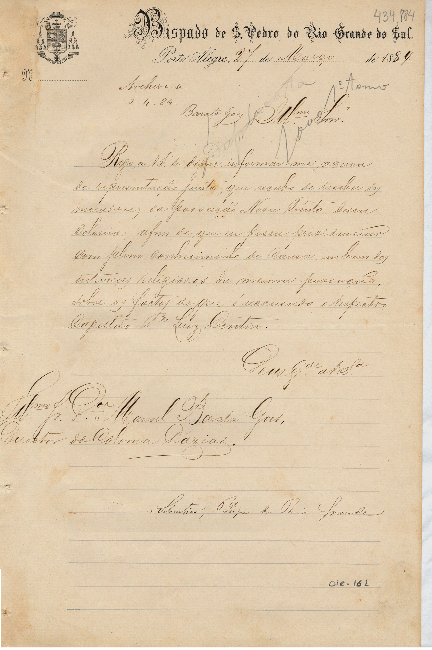 Do Bispado de São Pedro do Rio Grande do Sul - Padre Sebastião - Bispo de Rio Grande, para o Sr. Manoel Barata Góes - Diretor da Colônia Caxias. Assunto: solicita informações sobre os fatos de que é acusado o padre Luiz Centin, Capelão de Nova Trento.